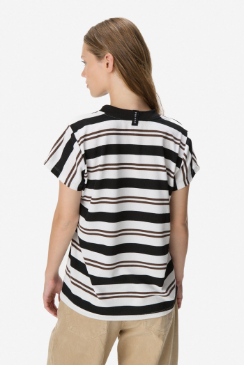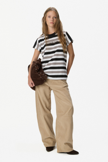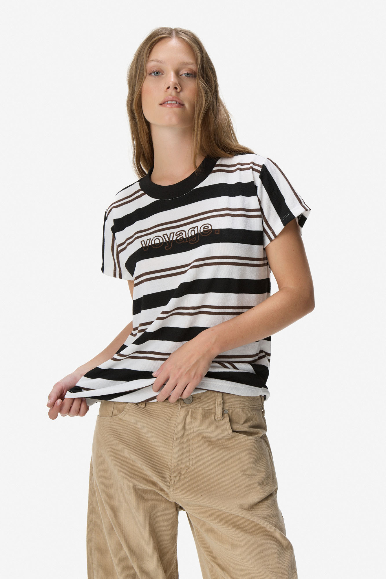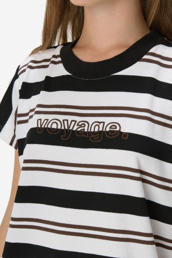 Remera de manga corta con cuello redondo, confeccionada en tejido con efecto tipo tejido que aporta textura. Presenta diseño a rayas combinadas y detalle frontal con tipografía “voyage” bordada, que suma un acabado de mayor calidad. Calce relajado, ideal para looks casuales con estilo. 73% poliéster, 27% algodón.