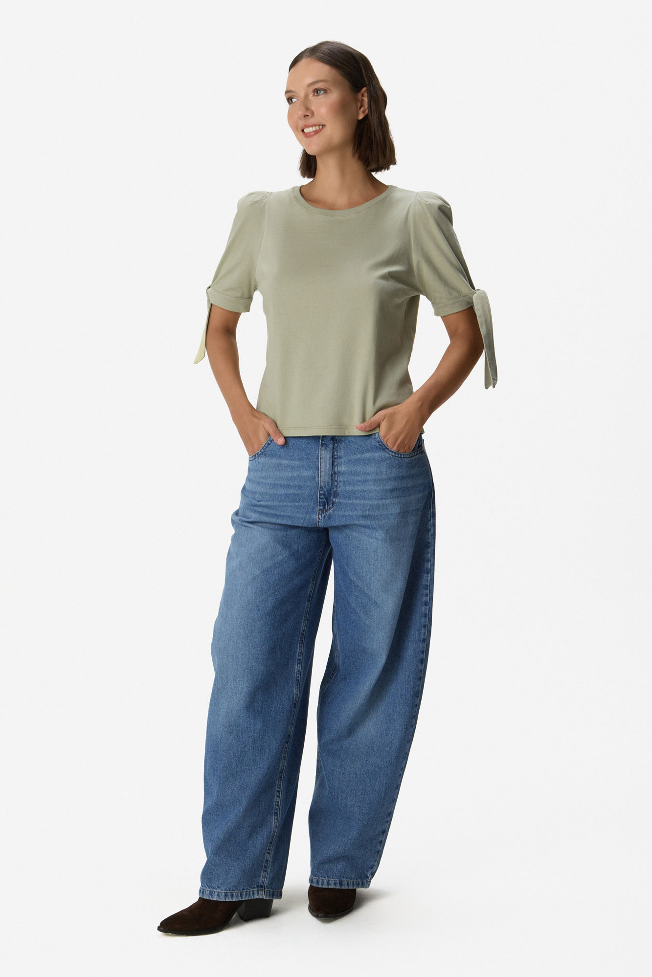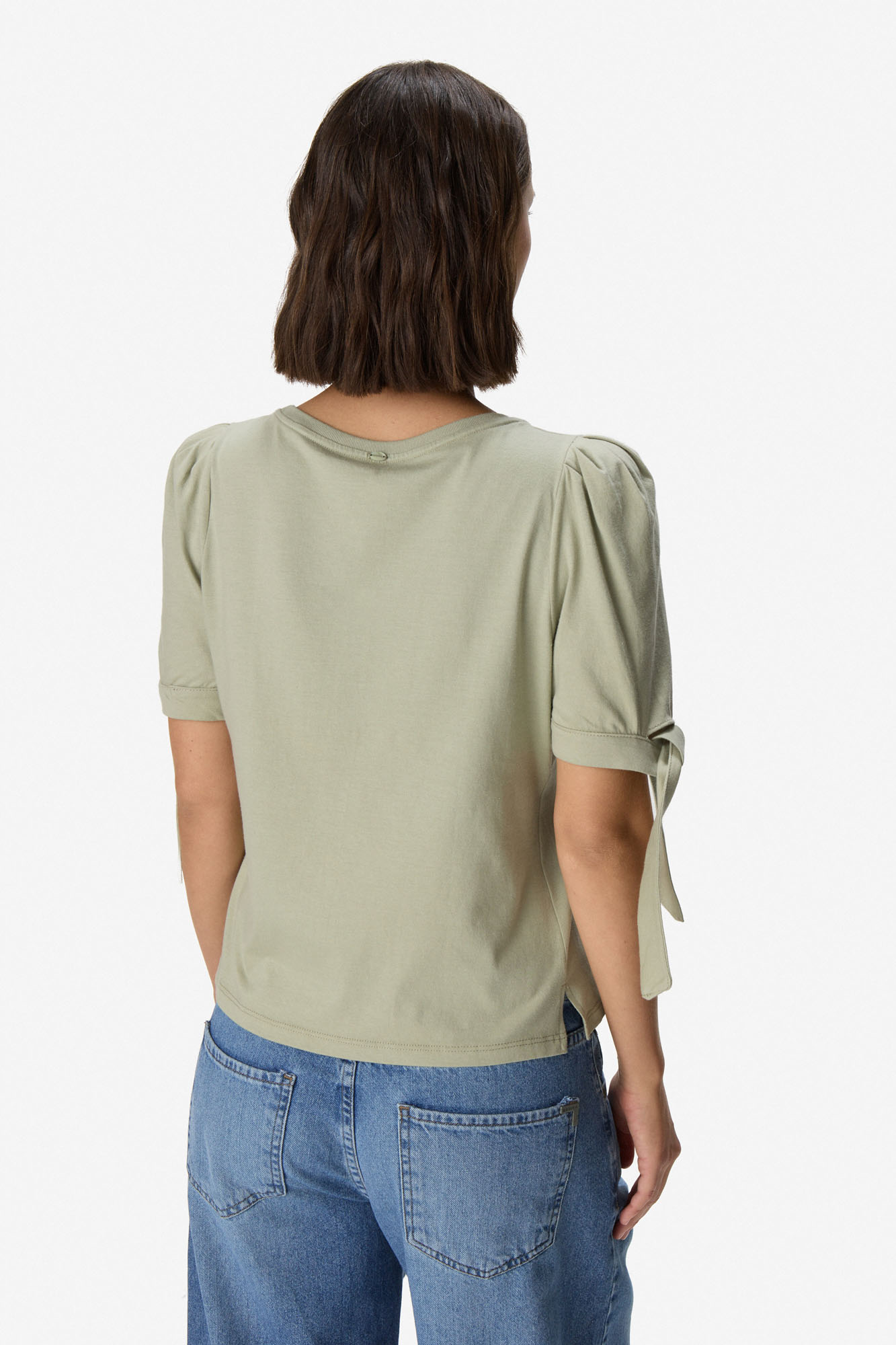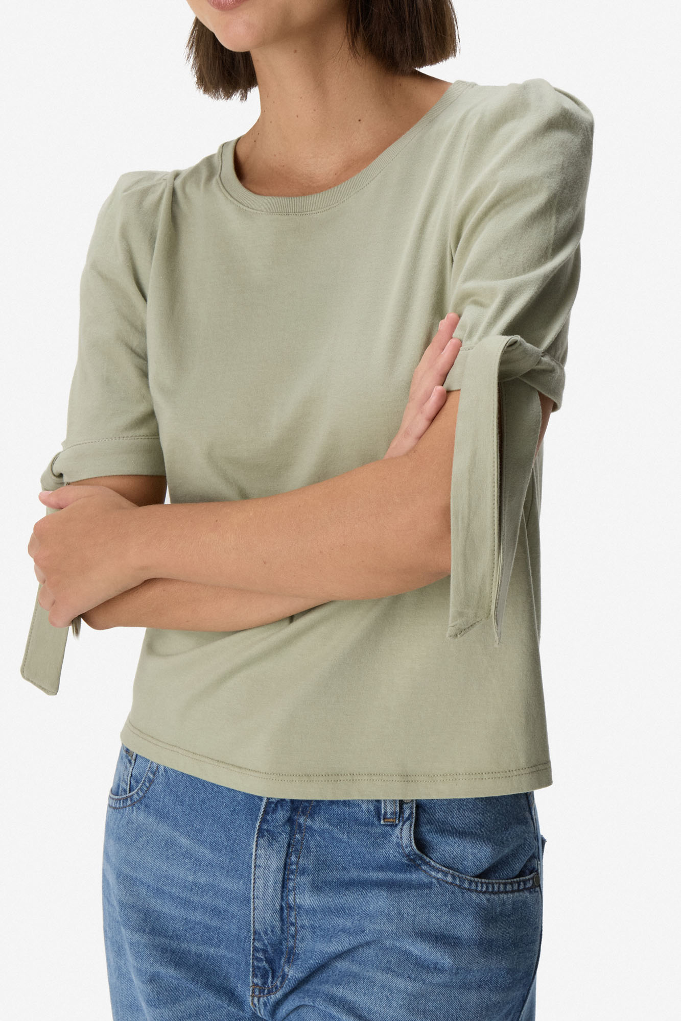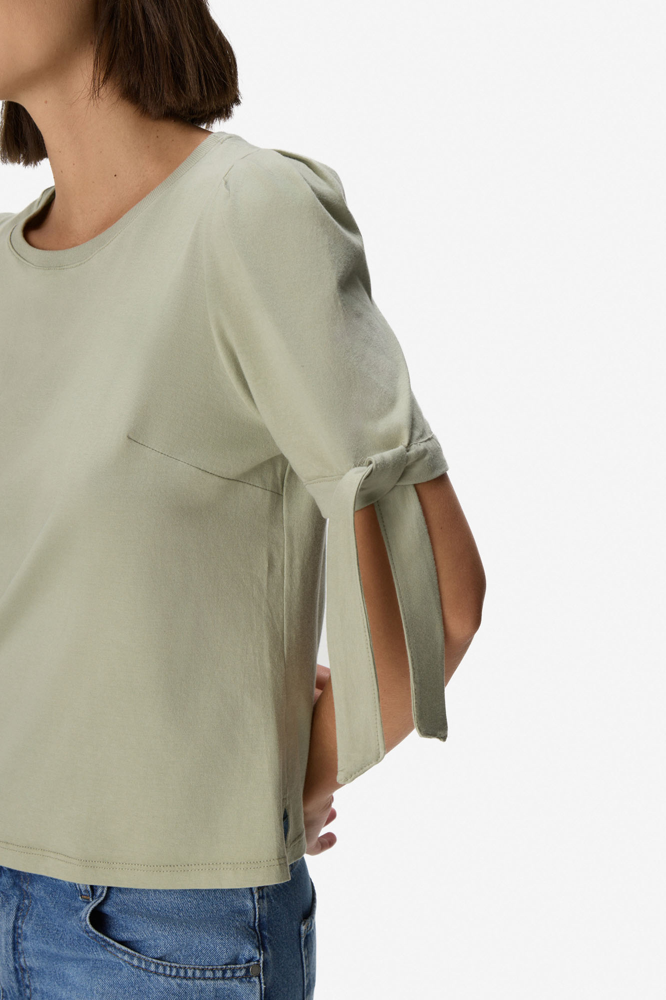 Remera de manga corta en algodón, con escote redondo y detalle de lazo en mangas princesa que aporta un toque femenino. De calce cómodo y silueta recta, es ideal para sumar color y estilo a tus looks de todos los días. 100% algodón.