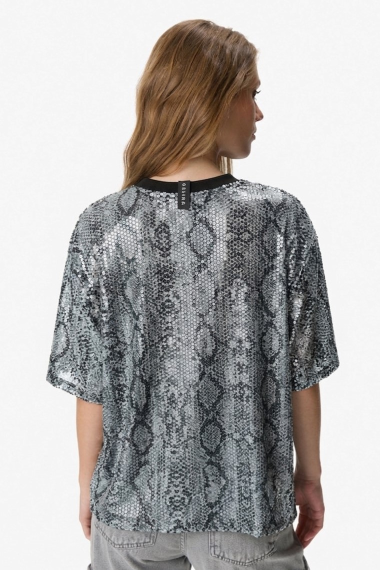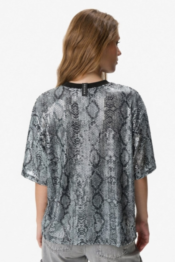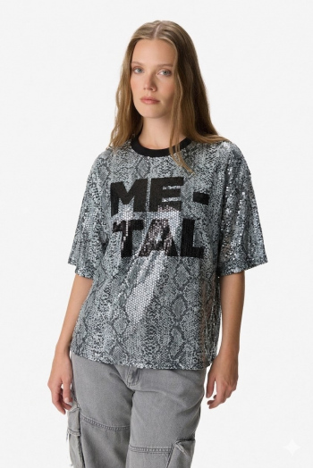 Remera de manga corta con cuello redondo, confeccionada en tejido liviano con textura tipo reptil. Presenta estampa frontal con tipografía y aplicación de strass que aporta brillo y un toque distintivo. Calce relajado, ideal para looks urbanos. 96% poliéster, 4% spandex.