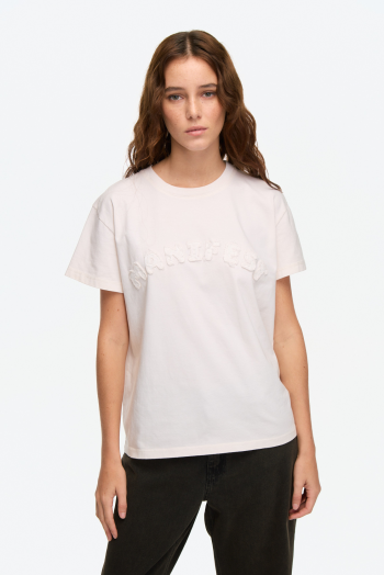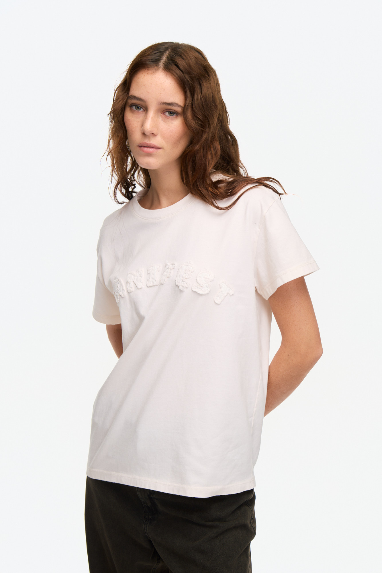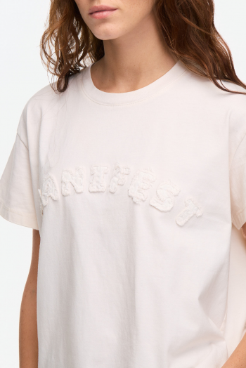 Remera de manga corta confeccionada en jersey de algodón, con escote redondo y calce clásico. Presenta bordado frontal “Manifest” a tono, que aporta textura y un detalle sutil al diseño. Un básico versátil para sumar a cualquier look. 100% algodón.