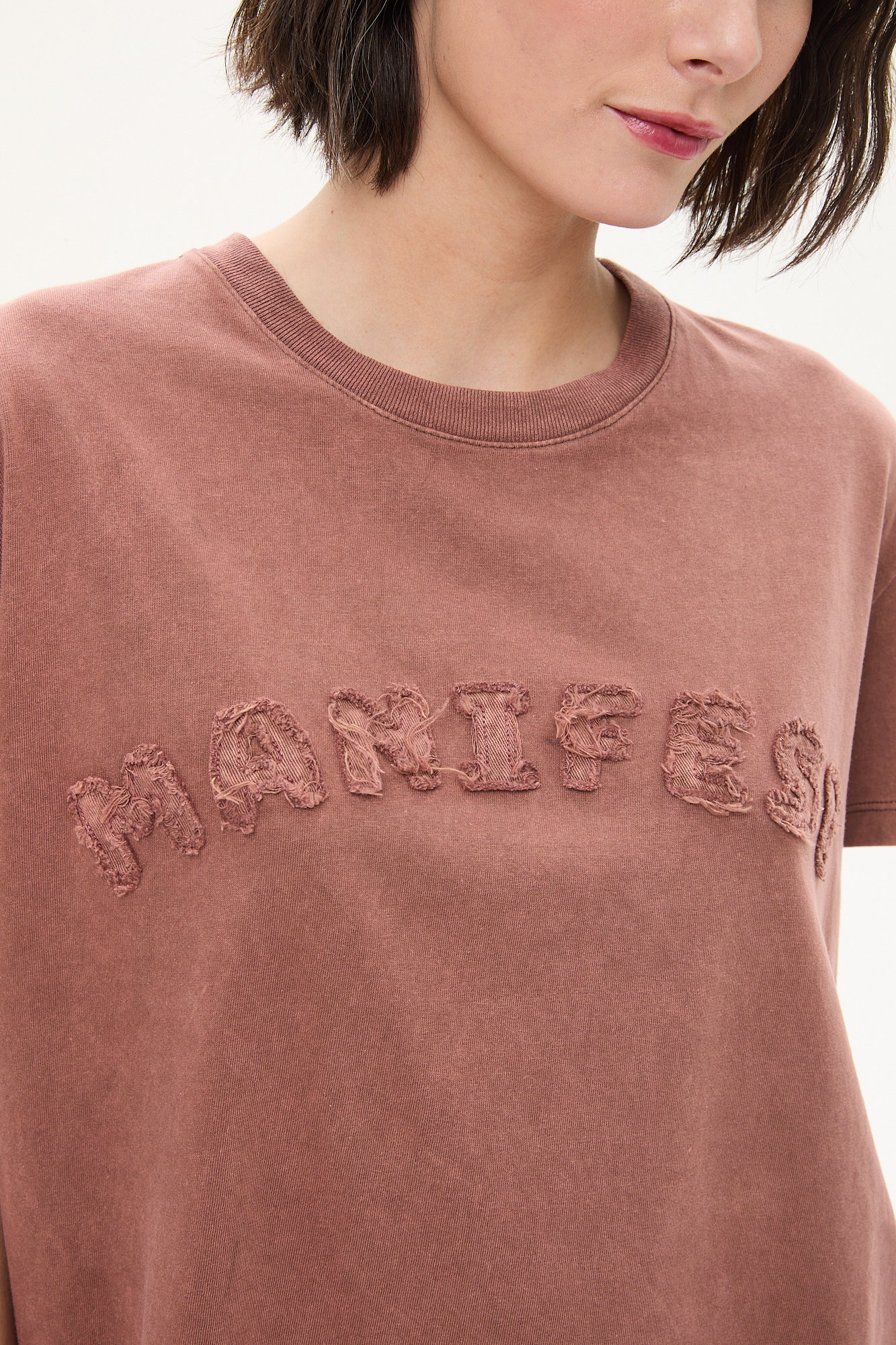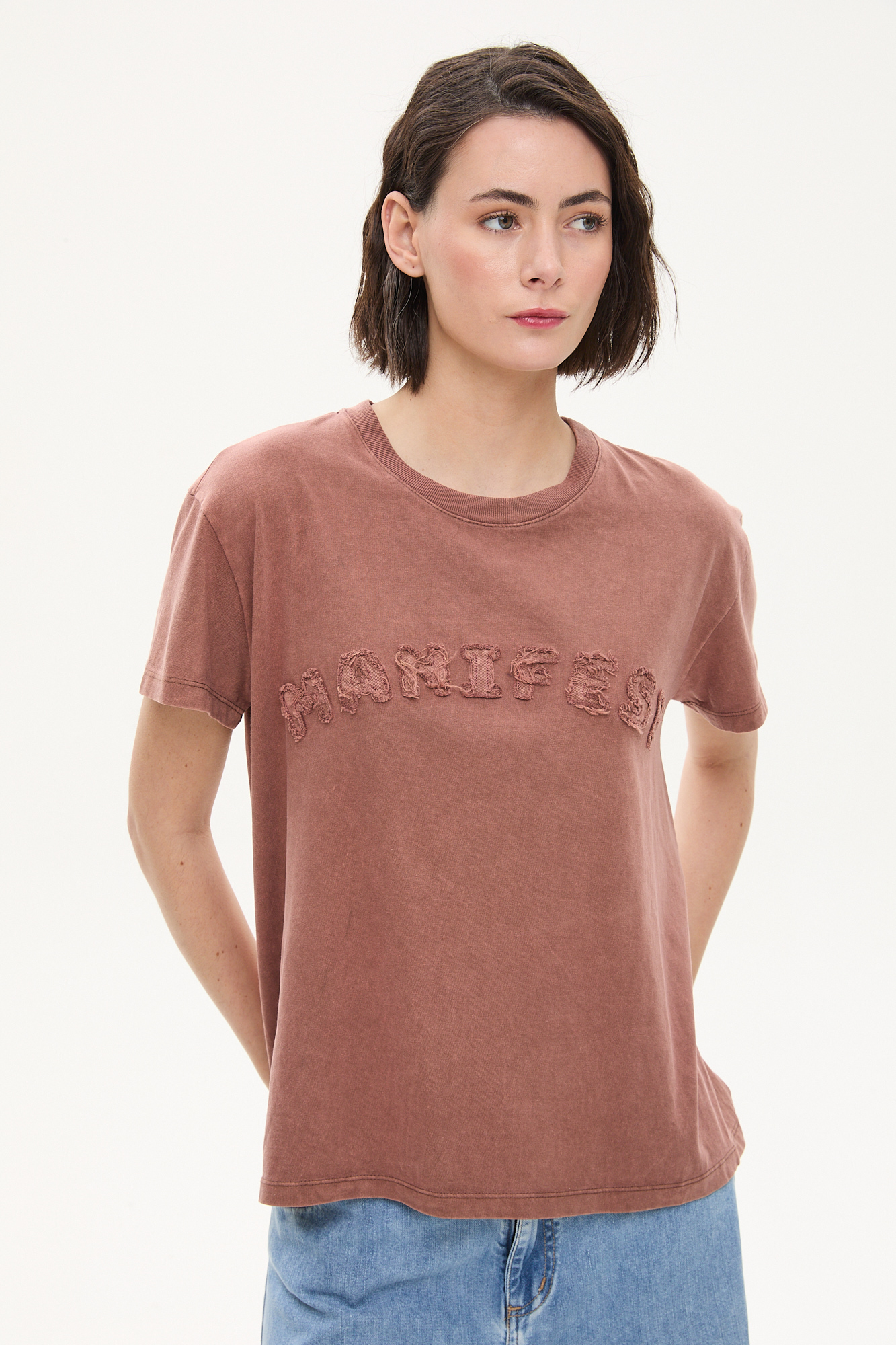 Remera de manga corta confeccionada en jersey de algodón, con escote redondo y calce clásico. Presenta bordado frontal “Manifest” a tono, que aporta textura y un detalle sutil al diseño. Un básico versátil para sumar a cualquier look. 100% algodón.