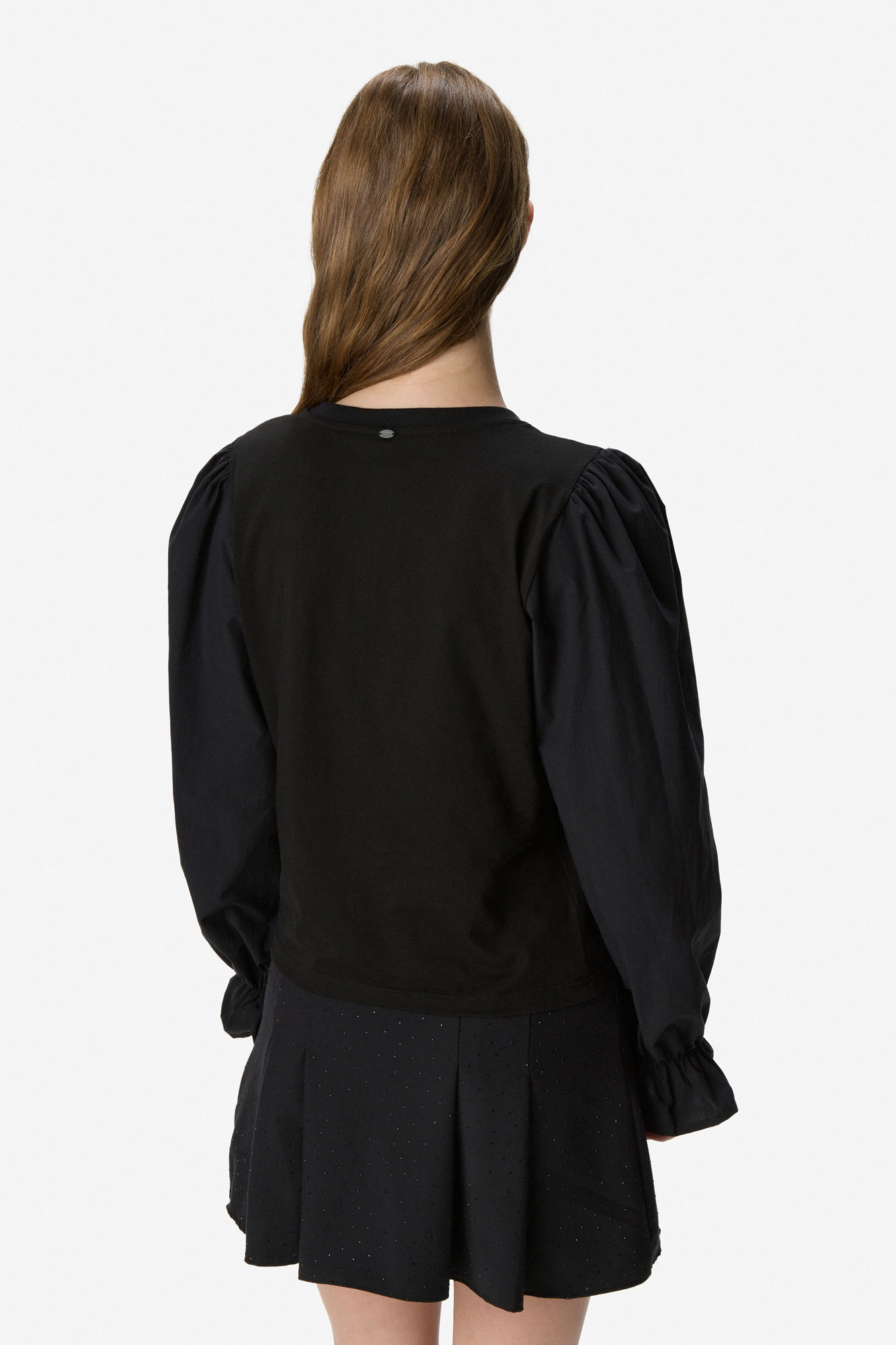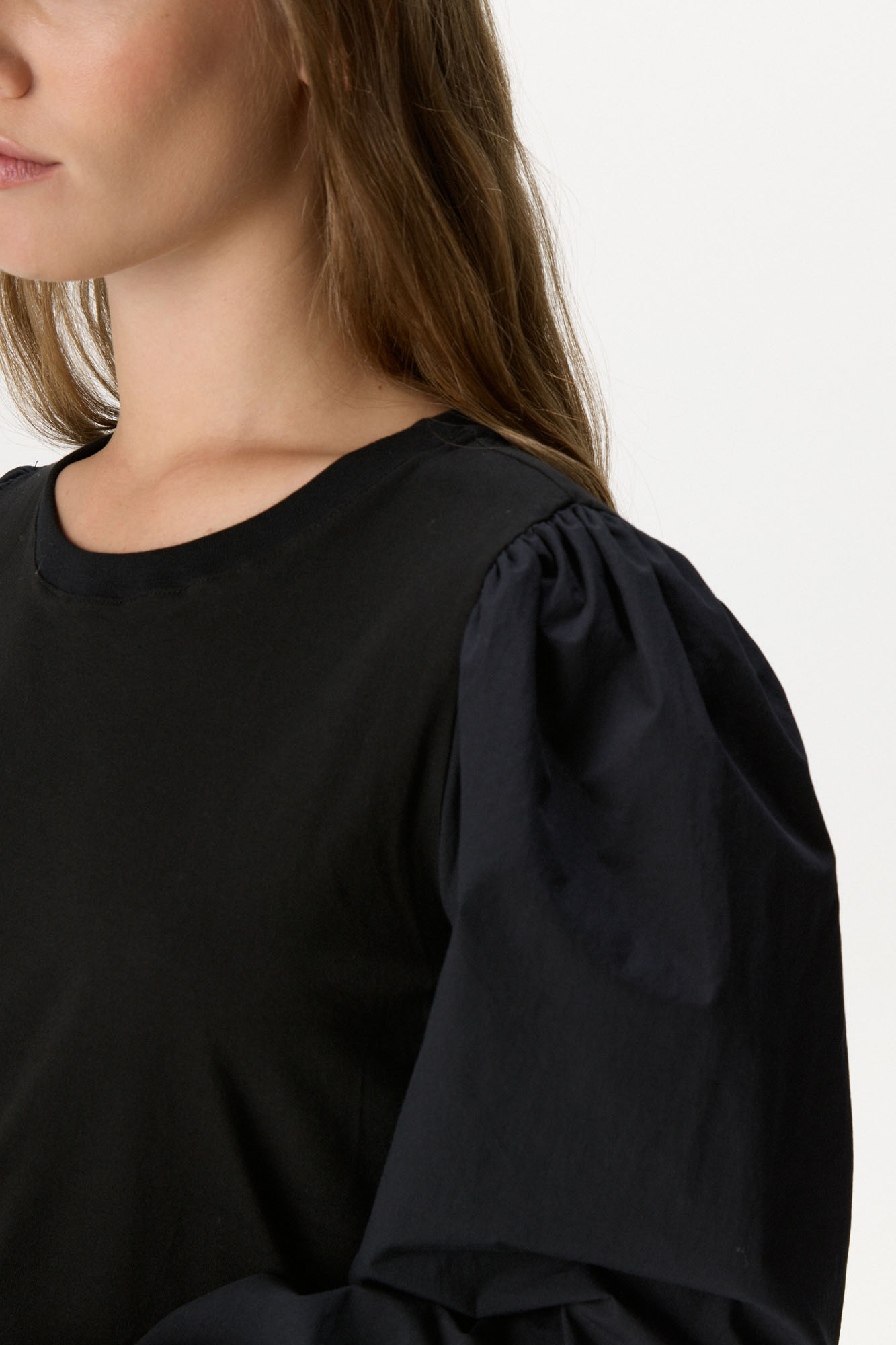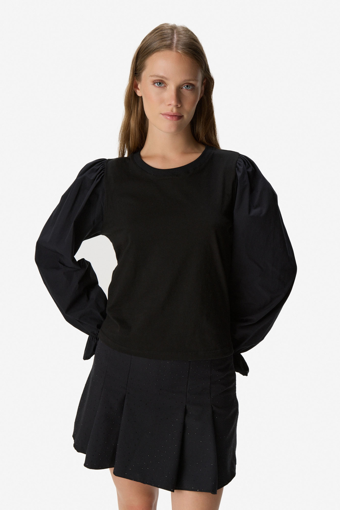 Remera confeccionada en algodón, de calce recto y largo a la primera cadera. Presenta cuello redondo y mangas largas con volumen, frunce en hombros y puños elastizados con terminación en volado. Tela suave y liviana. 100% algodón.