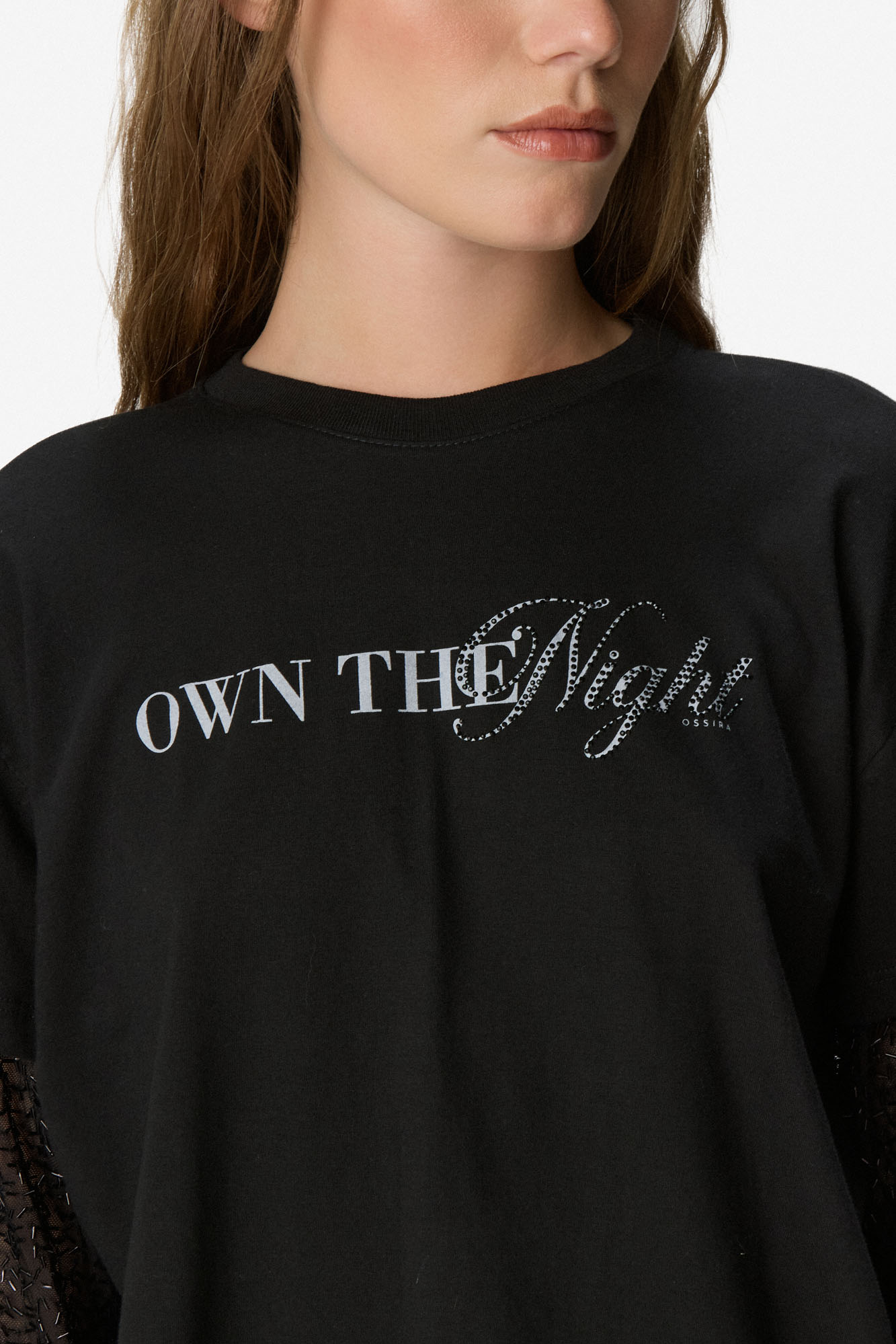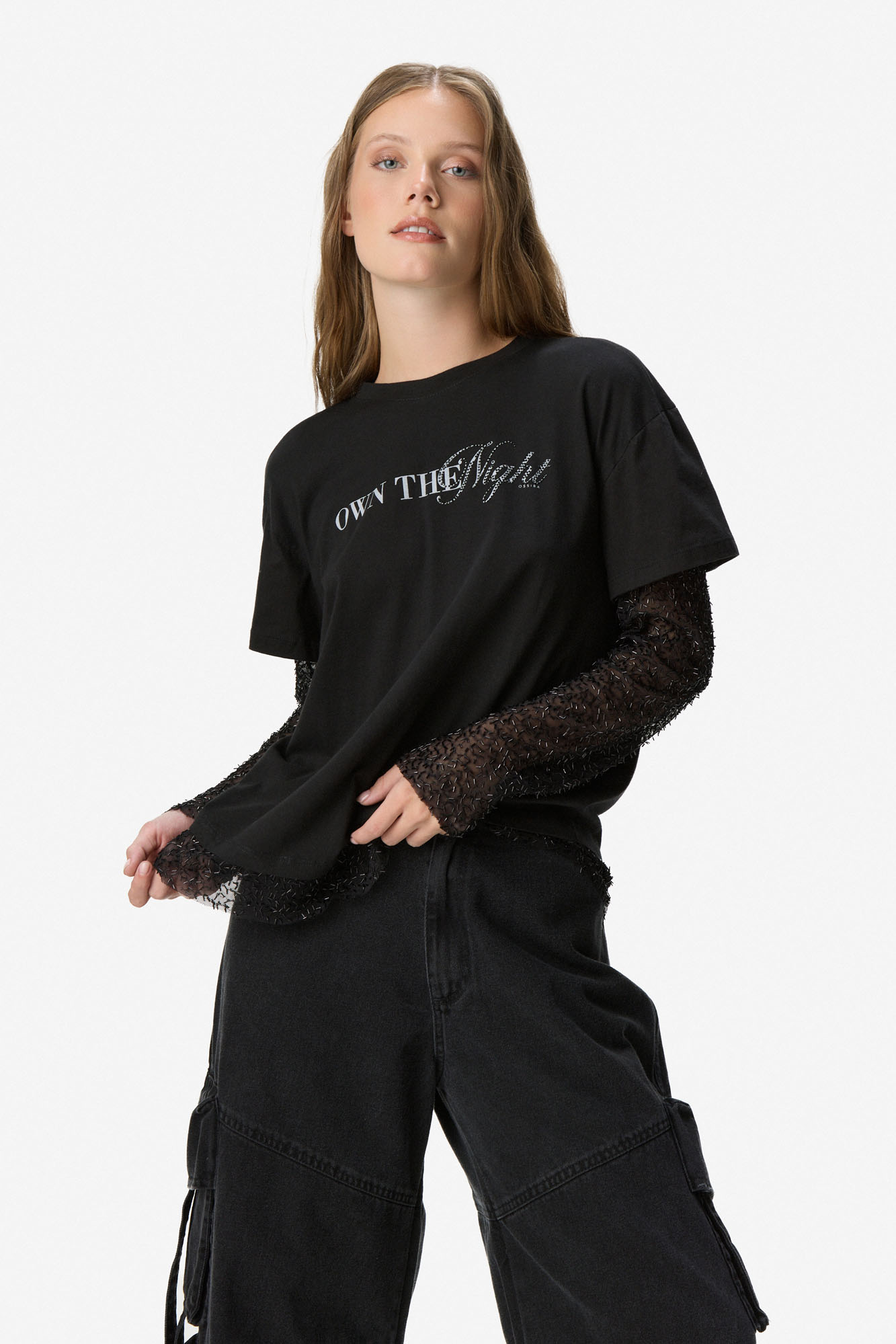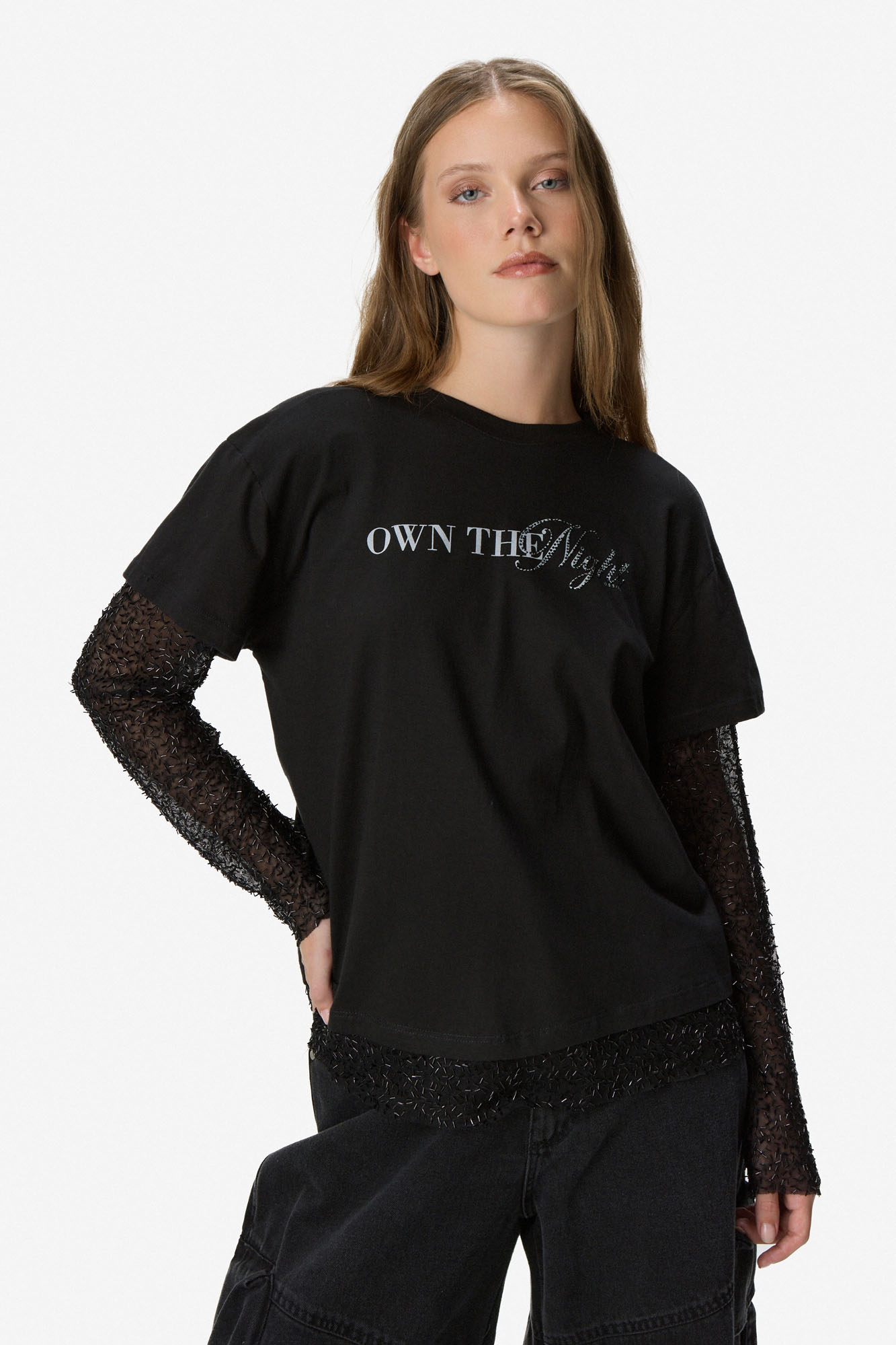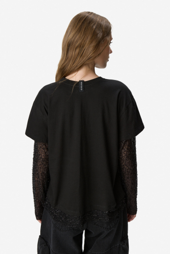 Remera de diseño combinado con cuerpo de algodón y mangas largas de tul que aportan un contraste moderno y delicado. Presenta calce relajado, cuello redondo y estampa tipográfica frontal que suma personalidad al diseño. Ideal para looks urbanos con un toque distintivo. Confeccionada en 100% algodón.