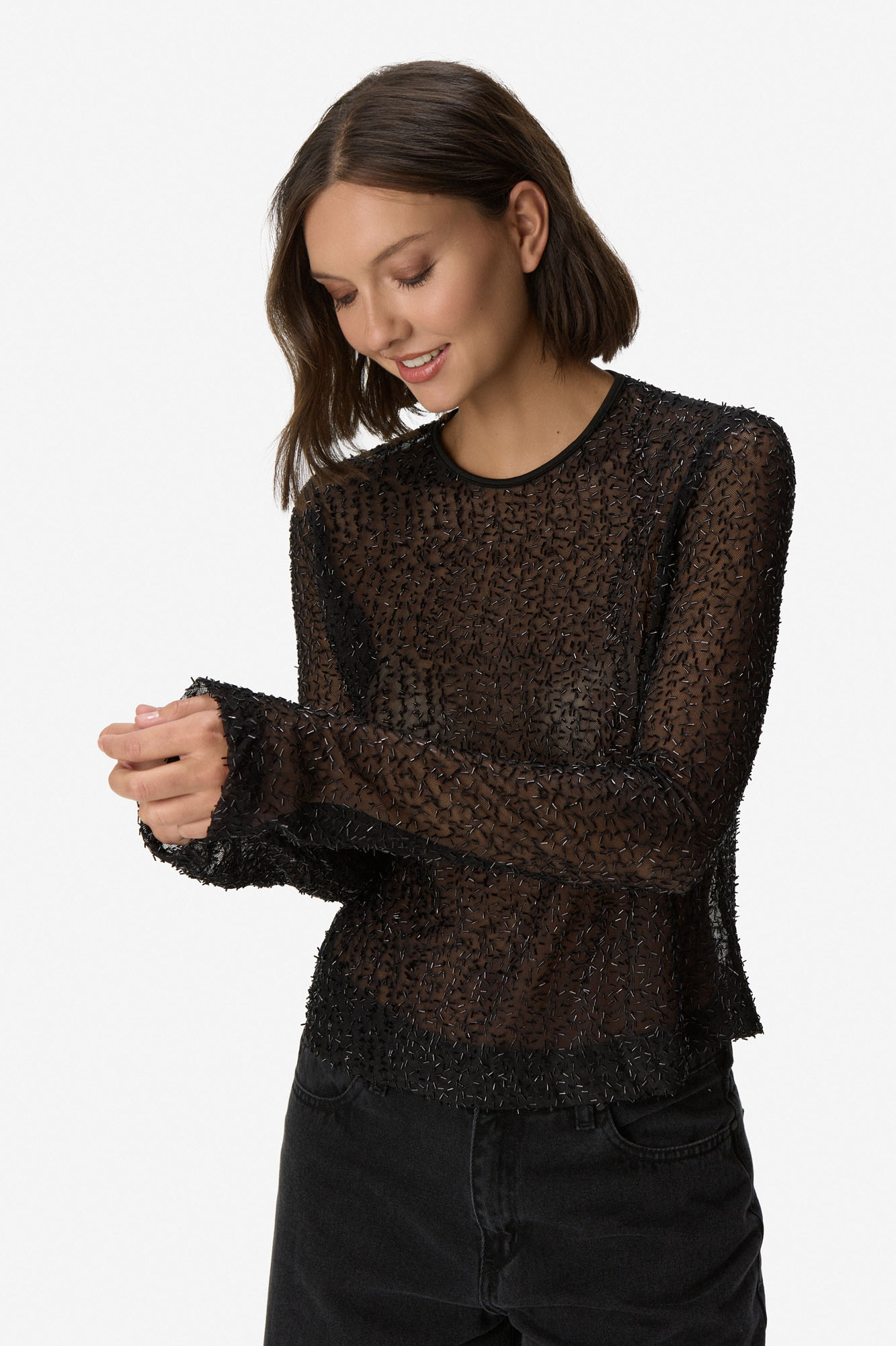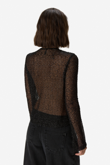 Blusa de manga larga en tejido translúcido con textura. De cuello redondo y calce recto. Diseño delicado con acabado brillante sutil que aporta un toque sofisticado. Ideal para usar en capas o como pieza protagonista.96% Poliéster. 4% Spandex