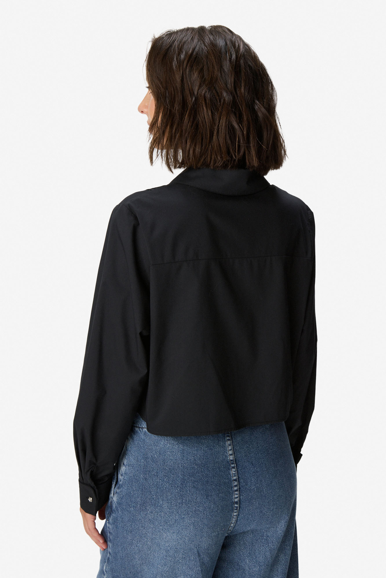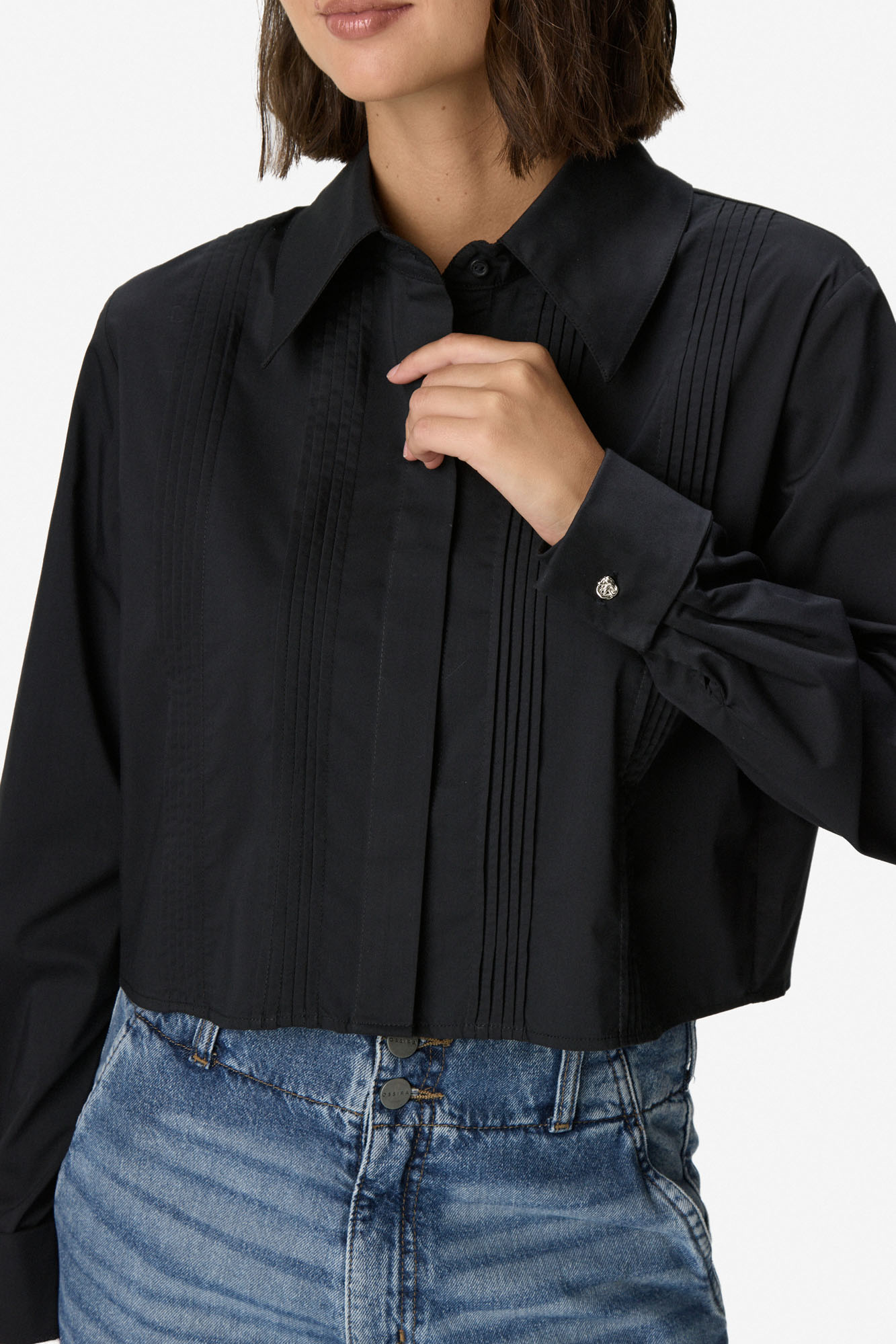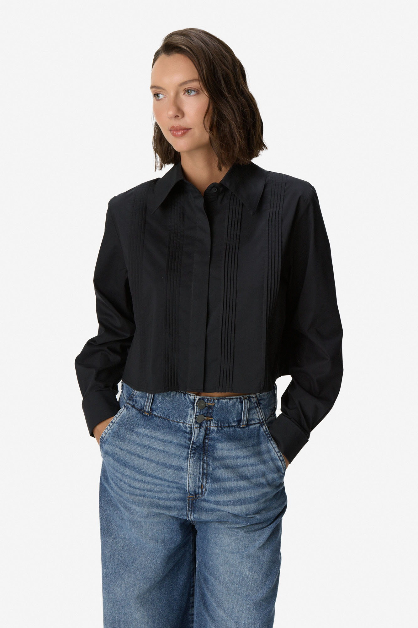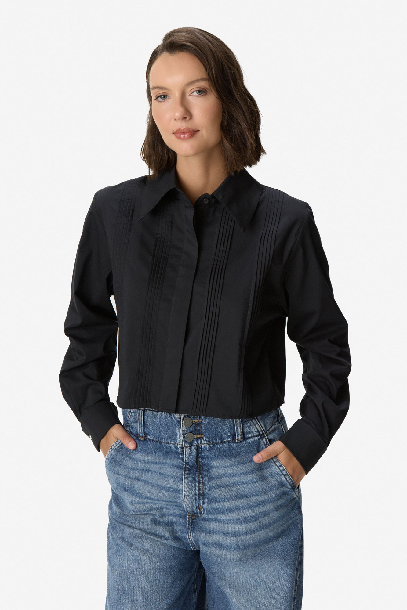Camisa de algodón con detalle de tablas verticales en el delantero. Cuello clásico y cierre frontal oculto con botonadura. Manga larga con puños abotonados. 100% Algodón.