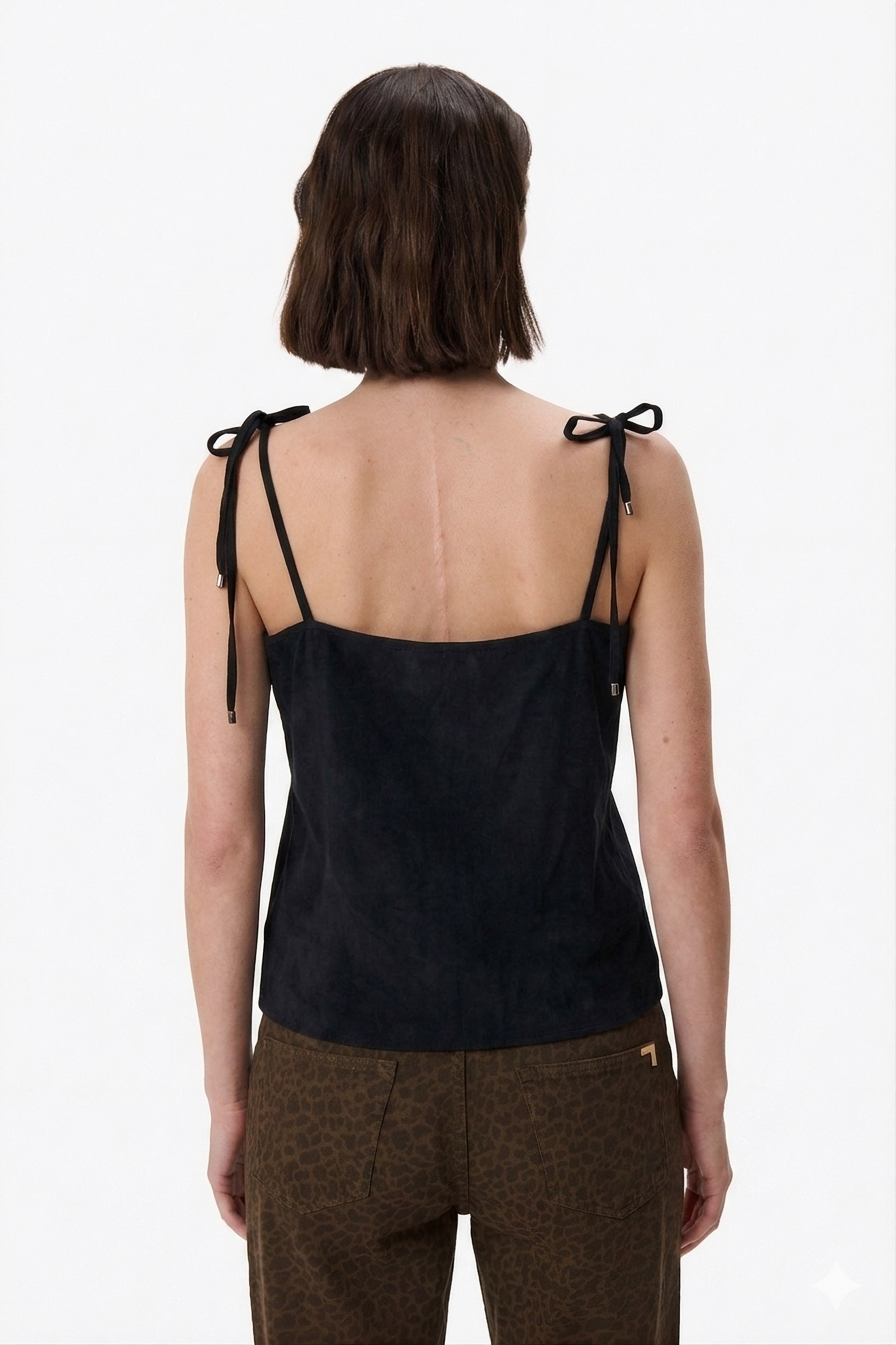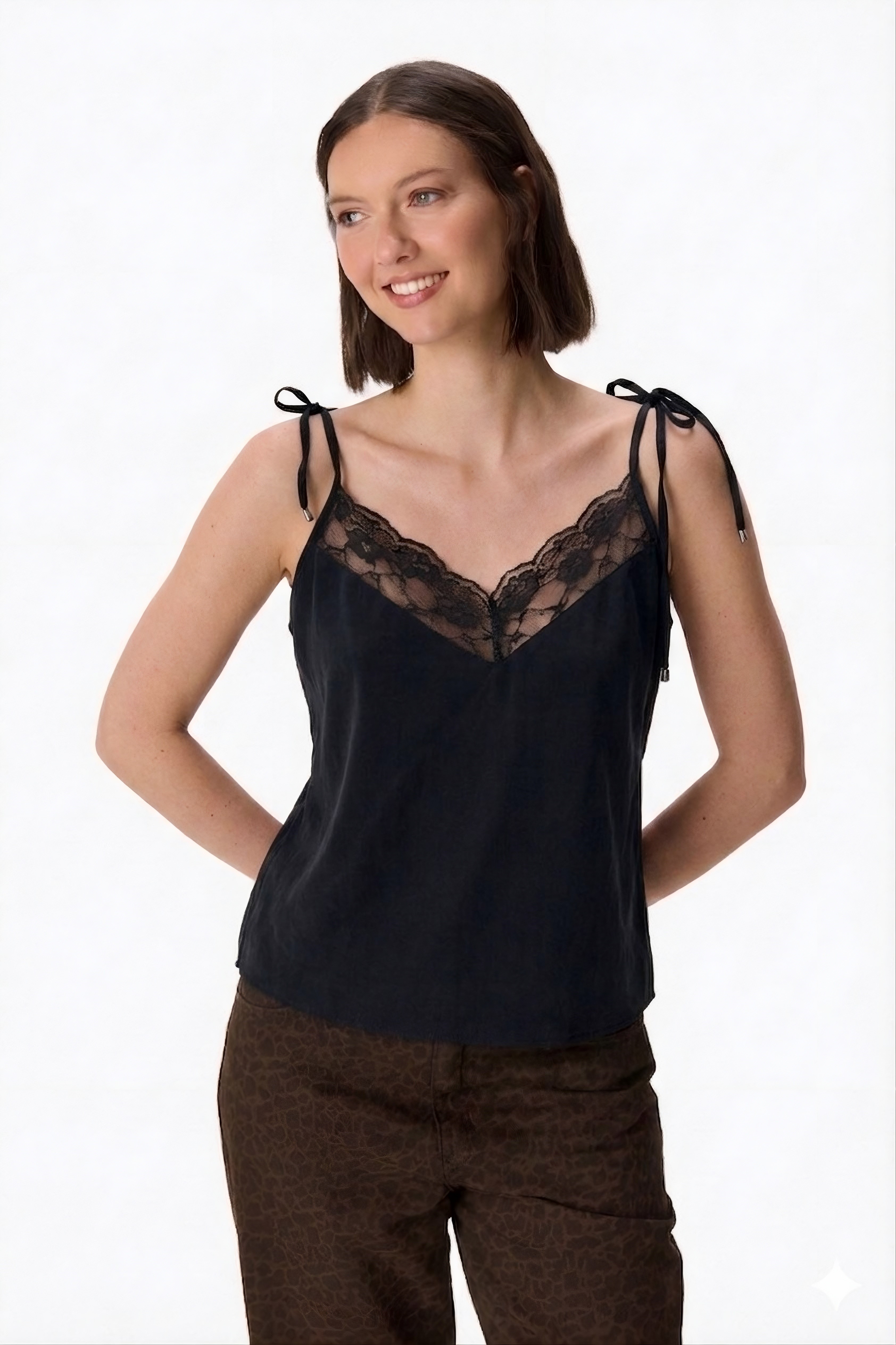 Musculosa tipo lencera confeccionada en tela de acabado suave, con efecto símil gamuza y calce recto. Presenta escote en V con detalle de puntilla aplicada y breteles finos para atar. 100% poliéster.