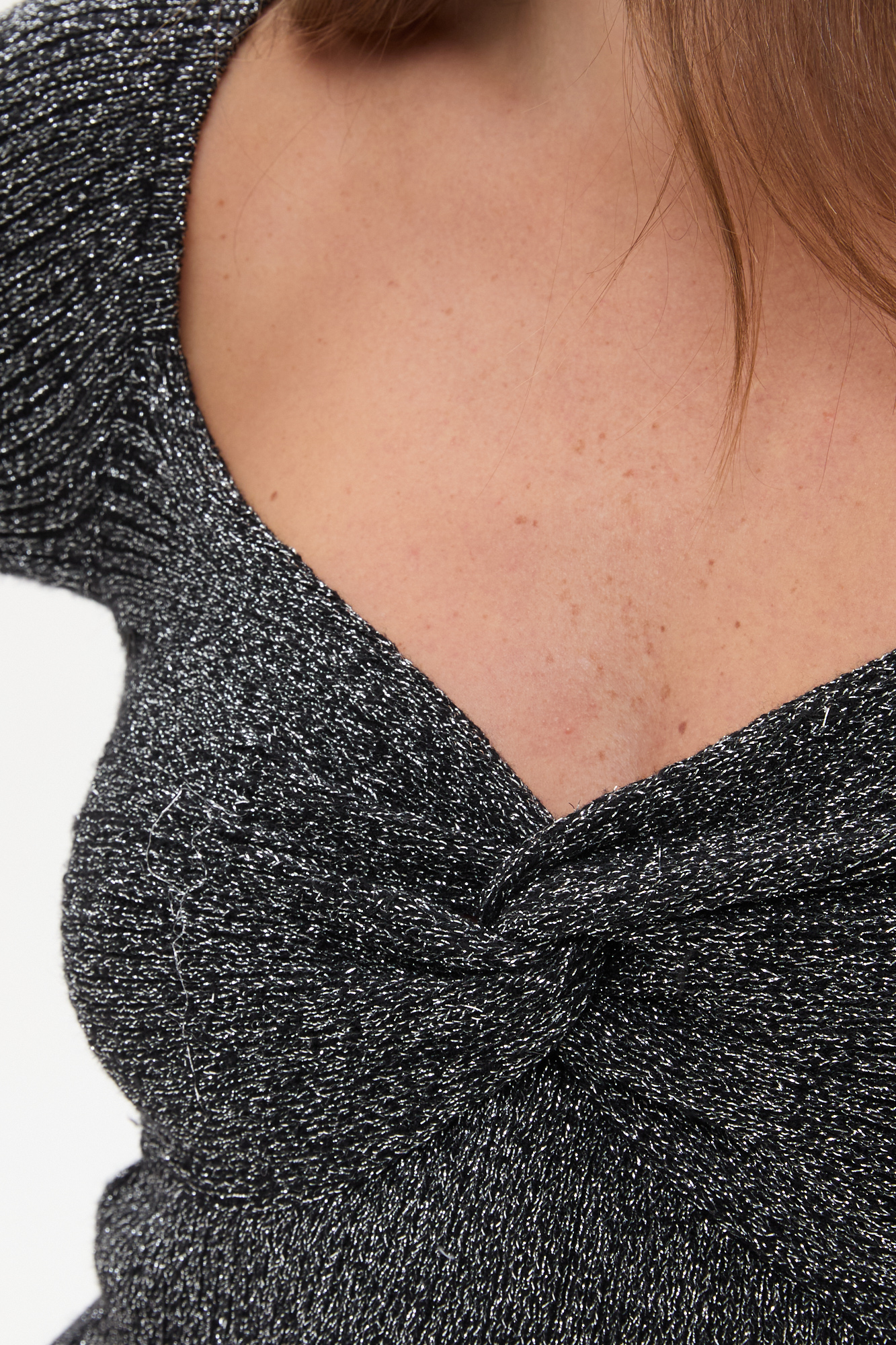 Sweater tejido con escote amplio y detalle fruncido en el delantero que define la silueta. Manga larga y calce al cuerpo que acompaña la forma. Terminaciones en rib en ruedo y puños. Confeccionado en hilado con mezcla de viscosa. 60% viscosa - 30% nylon - 10% poliéster.