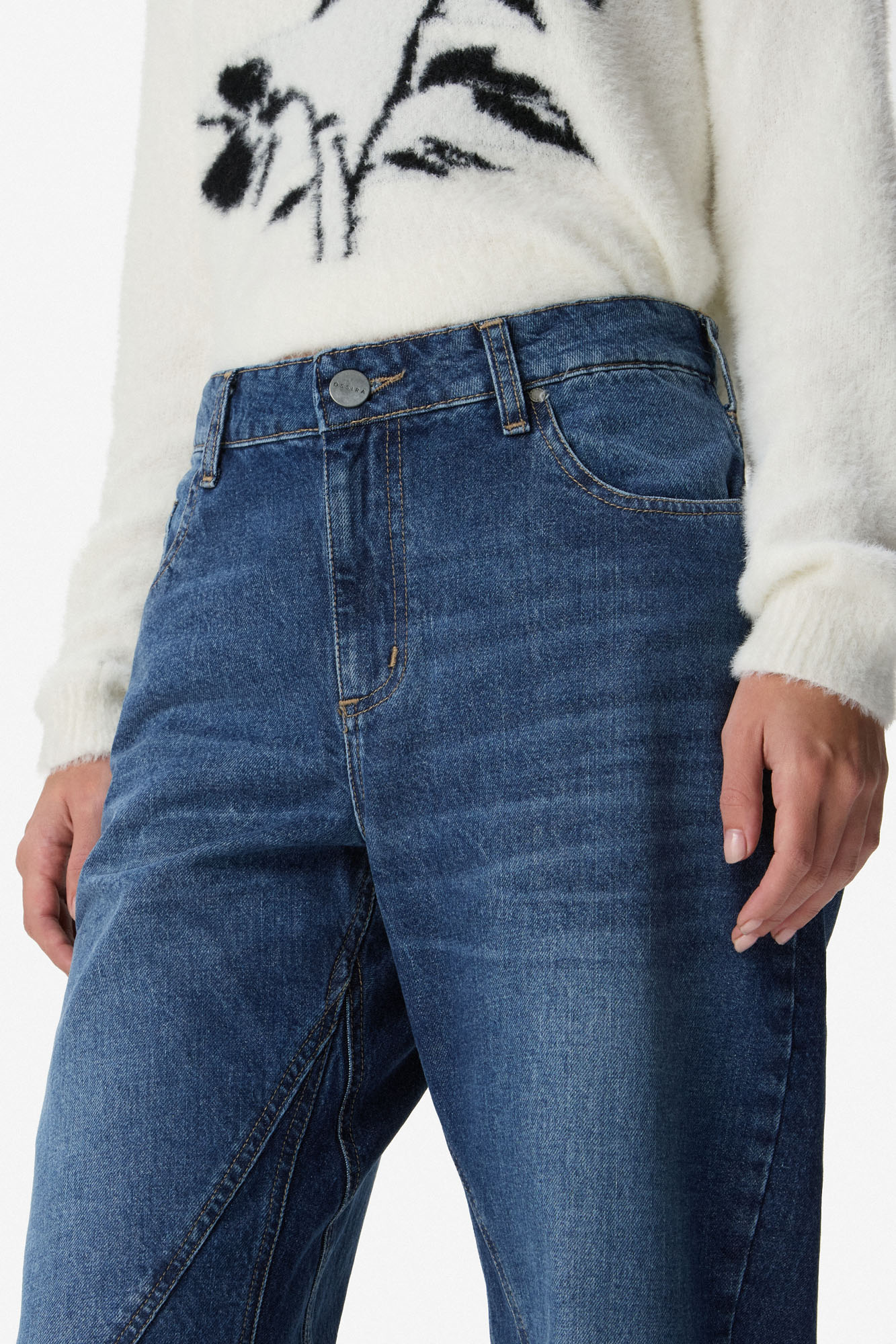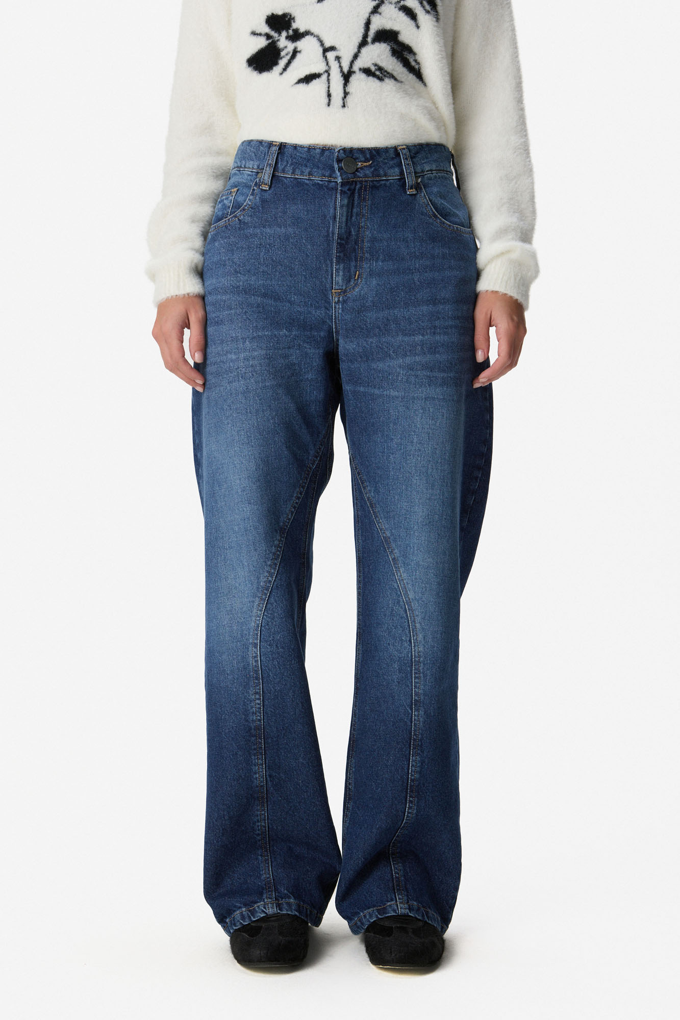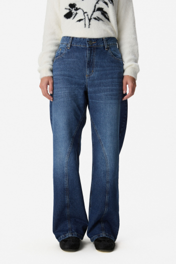 Jean de algodón con calce recto y tiro medio. Diseño con recortes en el delantero que estilizan la silueta. Cintura con presillas, acceso con cierre y botón metálico. Bolsillos delanteros y traseros. 100% Algodón.