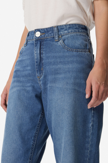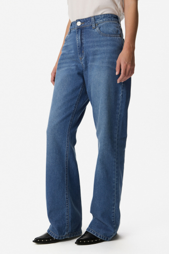 Pantalón de denim de algodón, de tiro alto y calce wide leg. Largo al tobillo, con lavado localizado y costuras a tono. Cintura con cierre delantero y botón metálico, bolsillos funcionales. Confeccionado en algodón 100%.