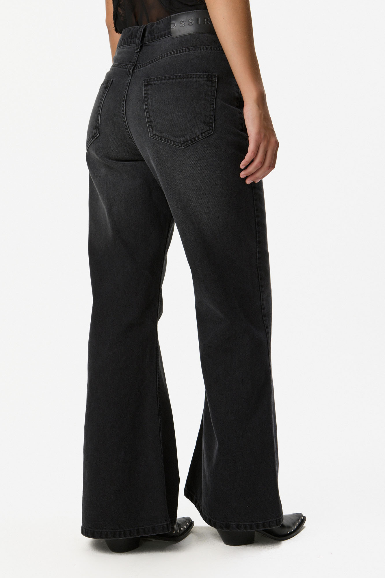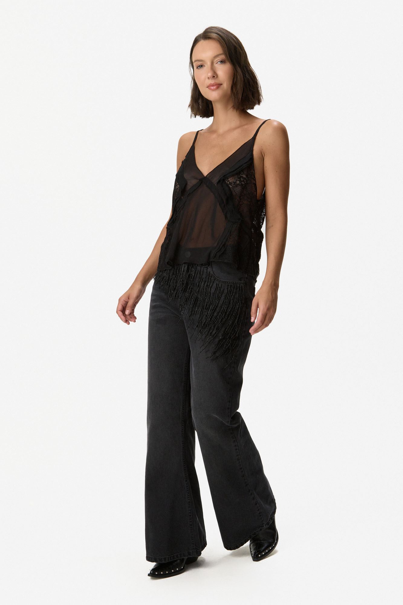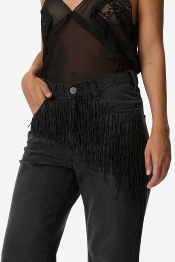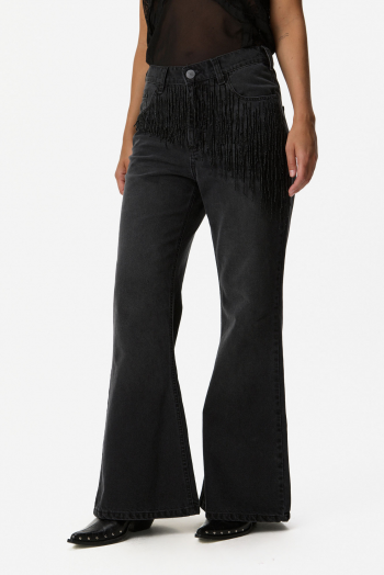 Pantalón de tiro medio en denim con acabado lavado. Calce ajustado en cadera y muslos que se abre en una bota amplia tipo flare, estilizando la silueta. Diseño con detalle de flecos aplicados en el frente que aporta movimiento y un estilo distintivo. Cintura con presillas y cierre frontal con botón. Una prenda llamativa y moderna, ideal para elevar looks tanto de día como de noche. 100% Algodón.