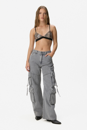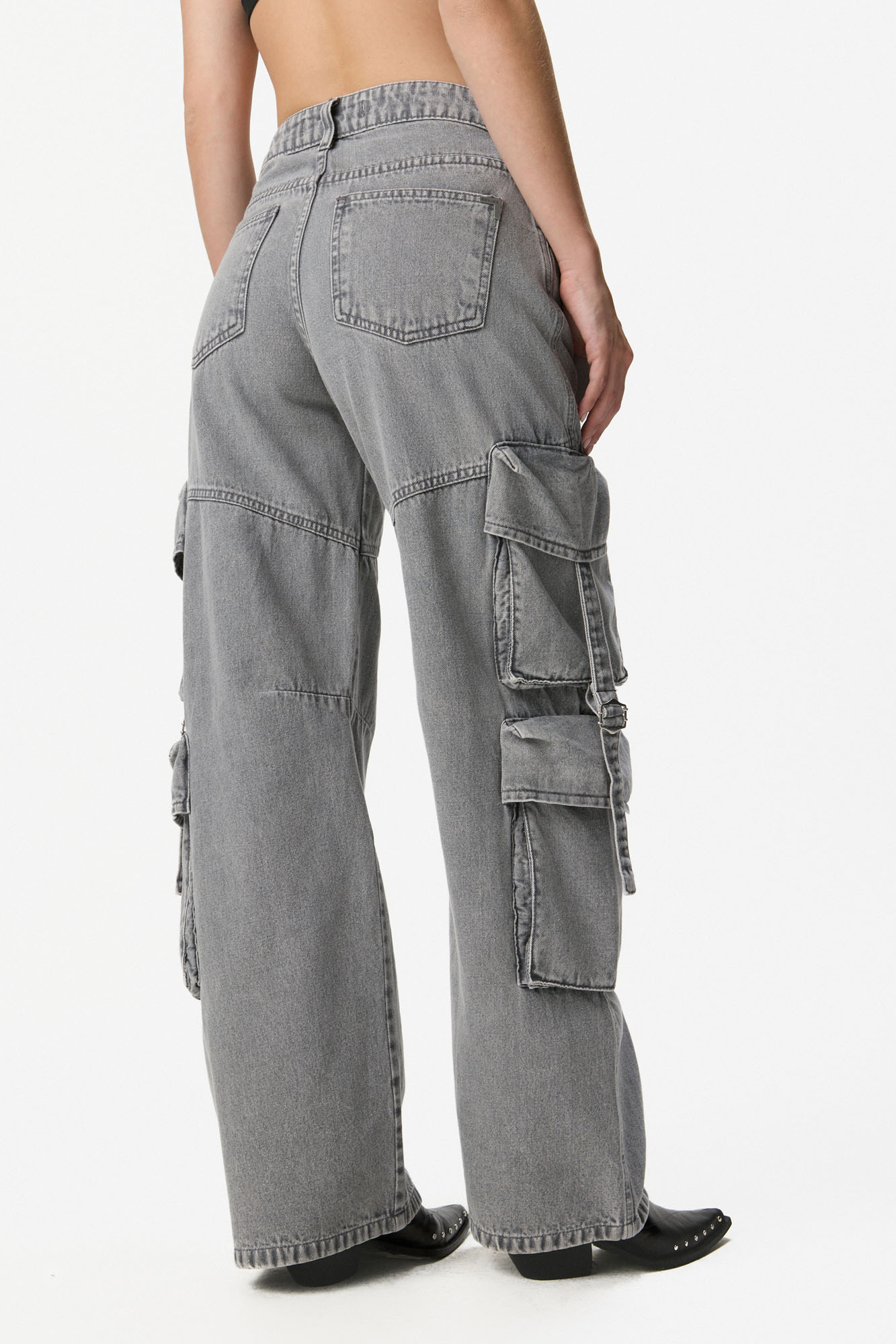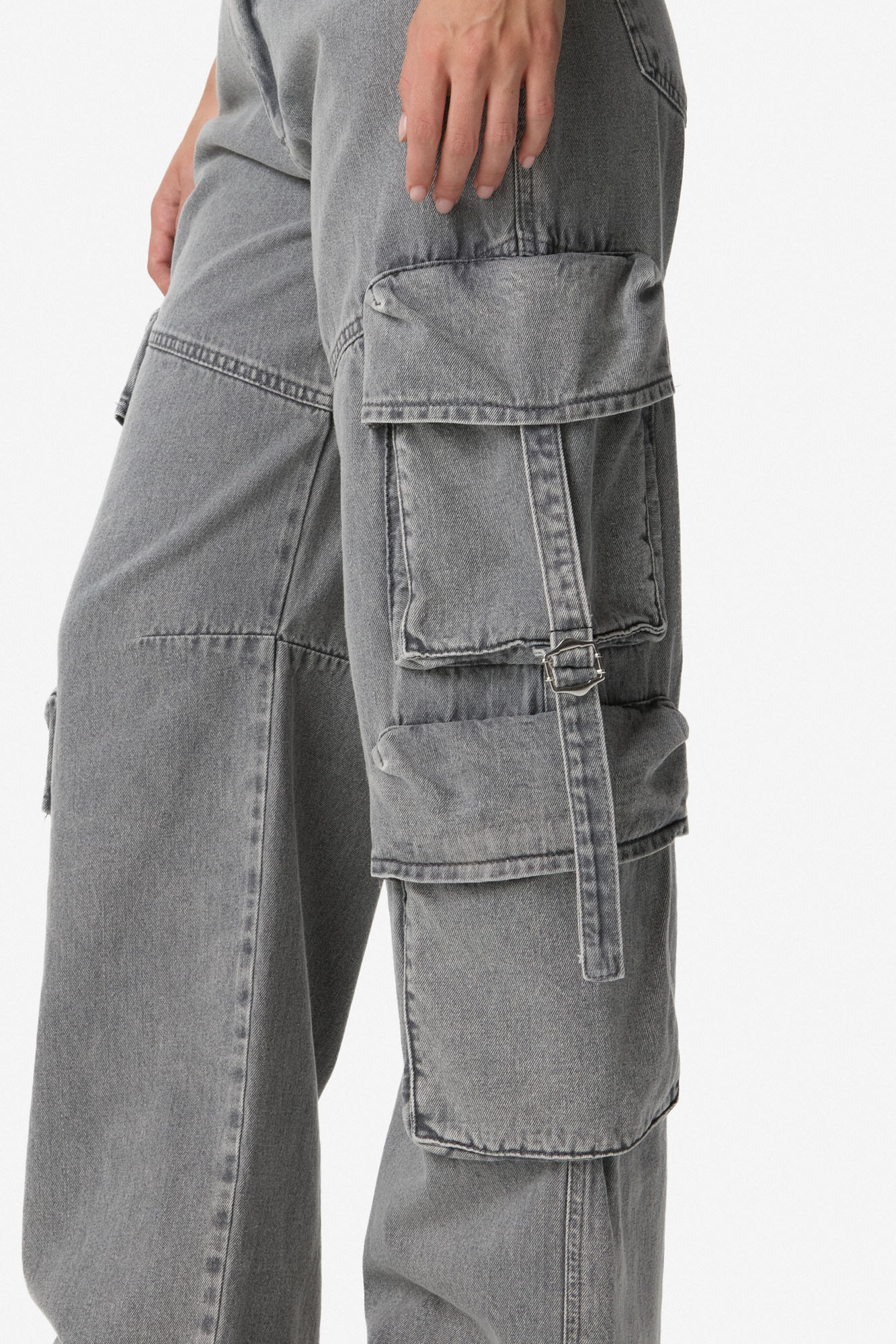 Cargo de tiro medio con calce relajado y caída recta. Confeccionado en denim de algodón, presenta recortes y bolsillos cargo en pierna con solapa, tiras de ajuste y hebillas como detalle distintivo. Cierre frontal con botón y cremallera. 100% algodón.