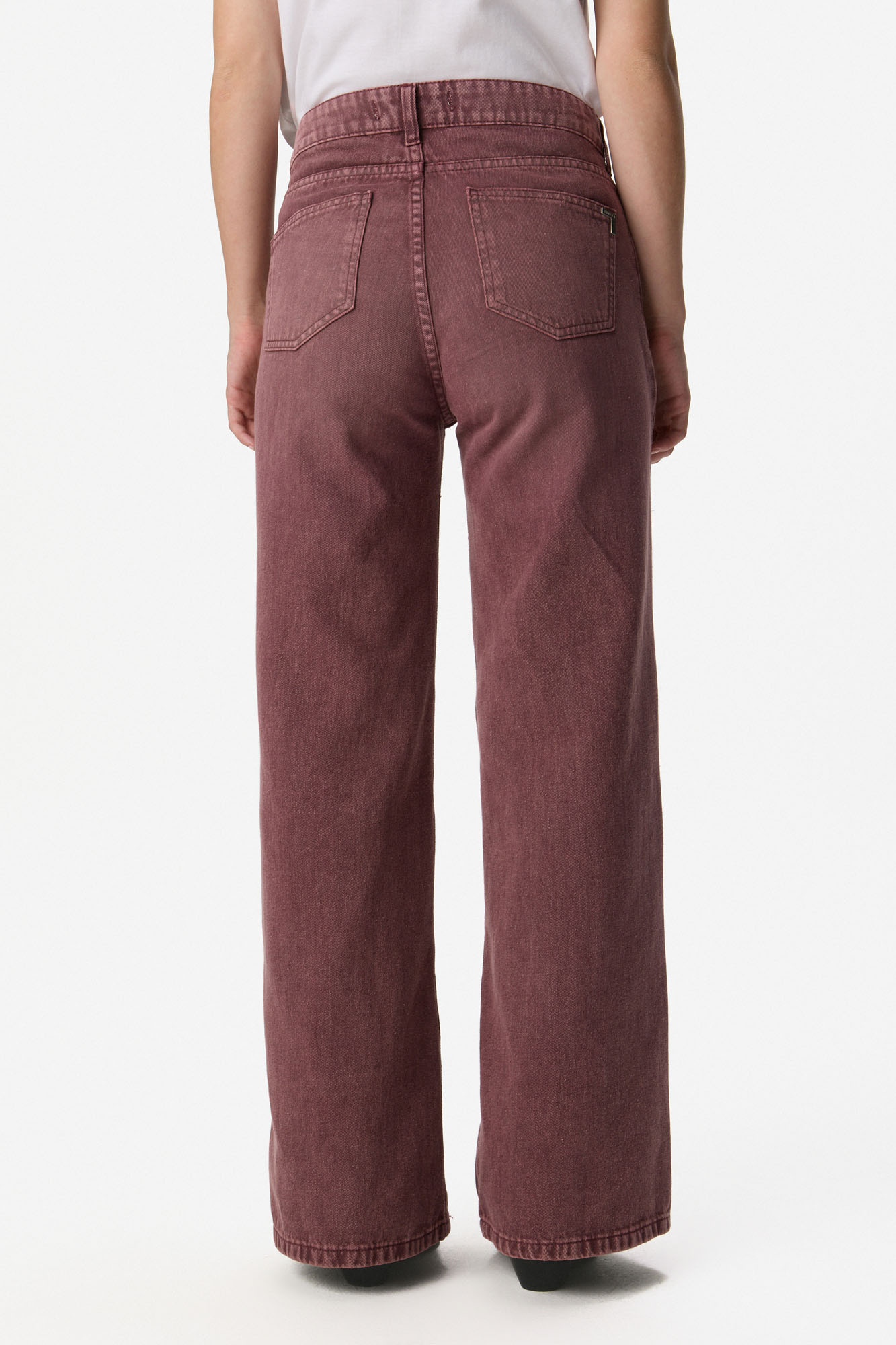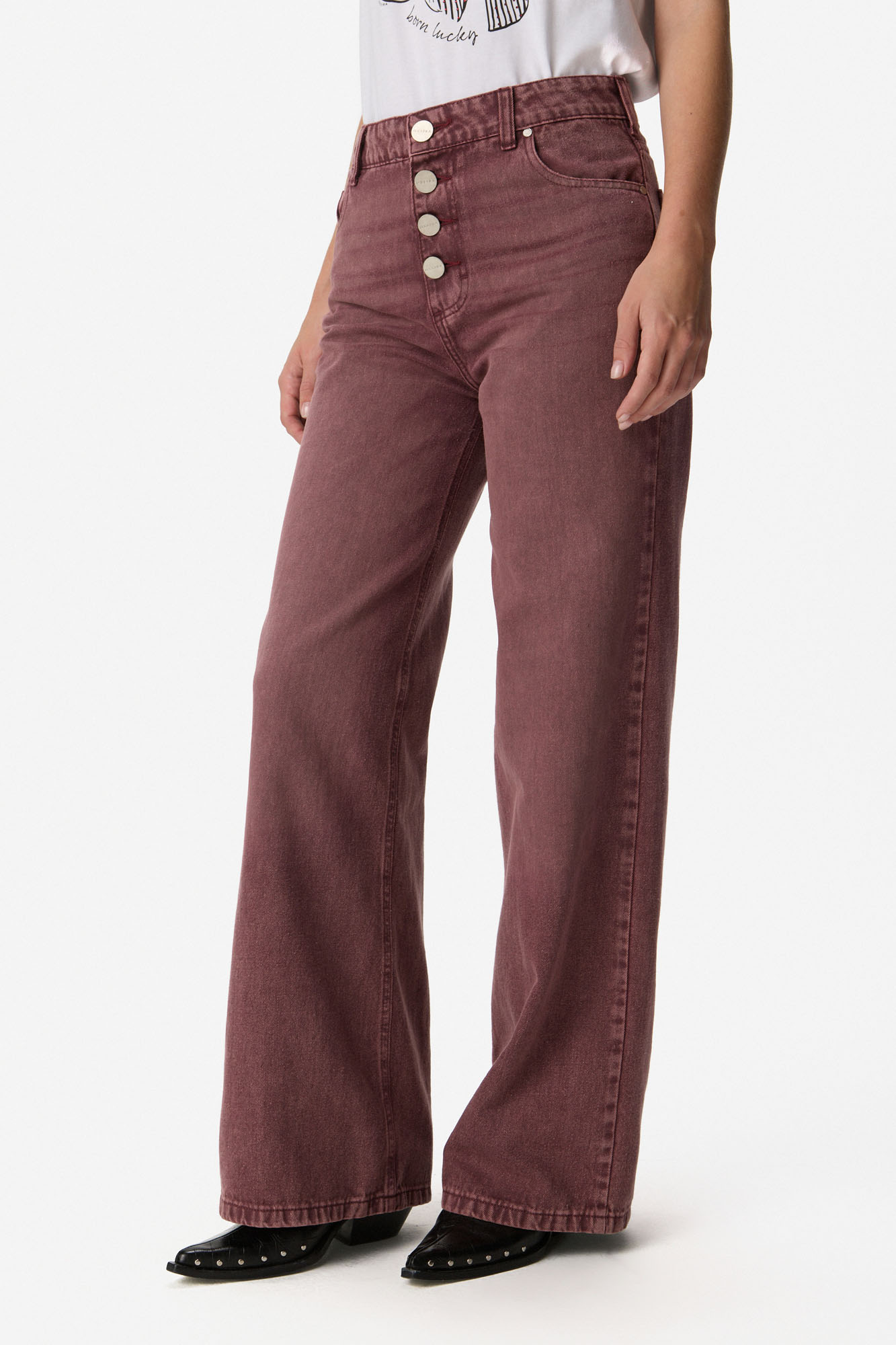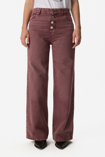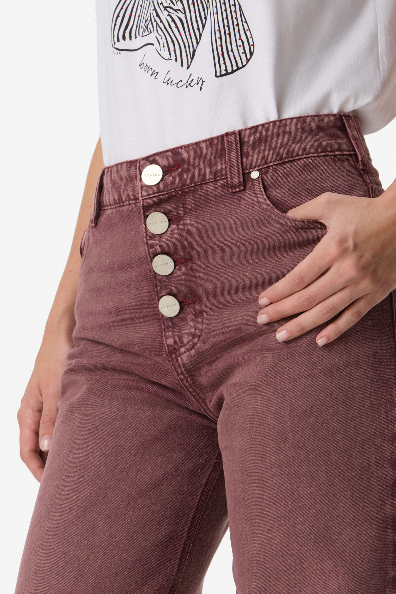 Pantalón de denim de algodón, de tiro alto y calce wide leg. Largo al tobillo, con lavado gastado y costuras a tono. Cintura con cartera de botones metálicos a la vista y bolsillos funcionales. Confeccionado en algodón 100%.