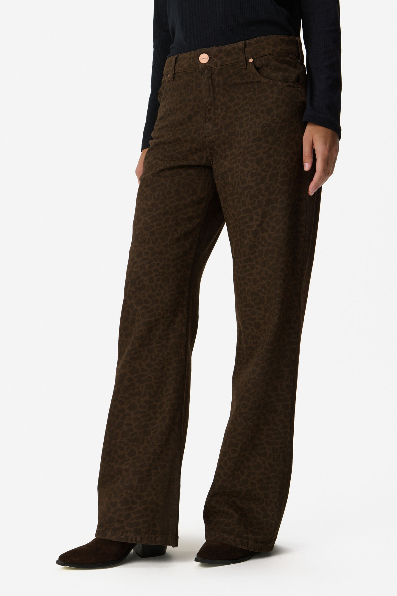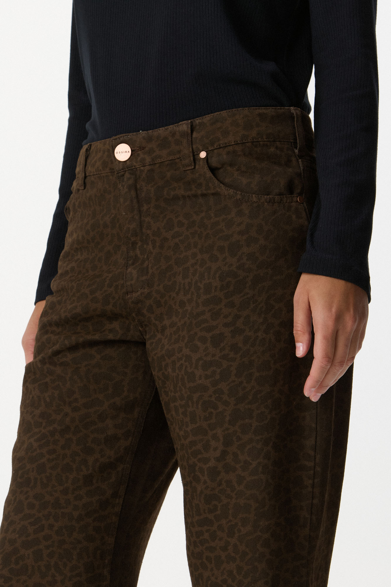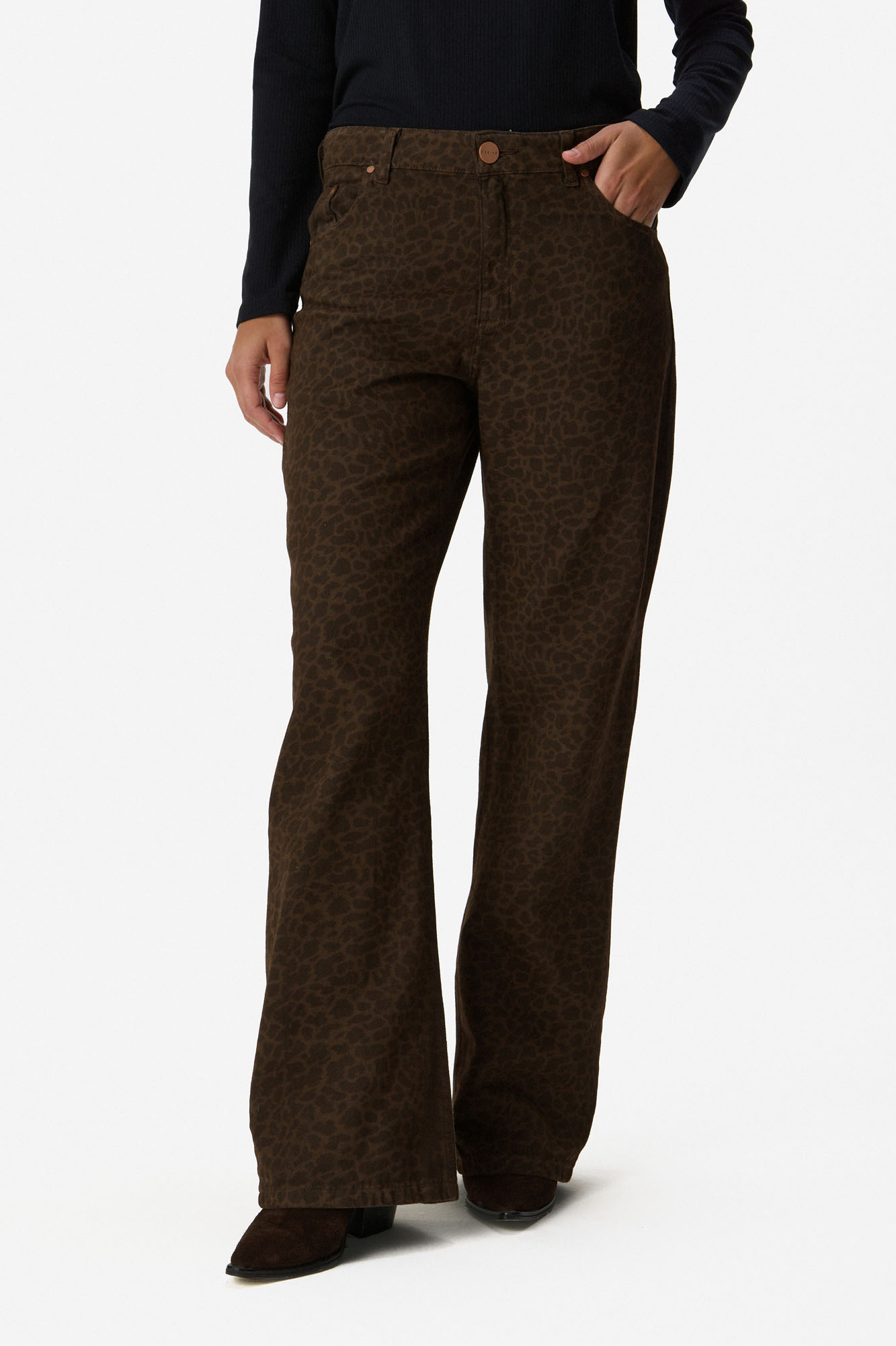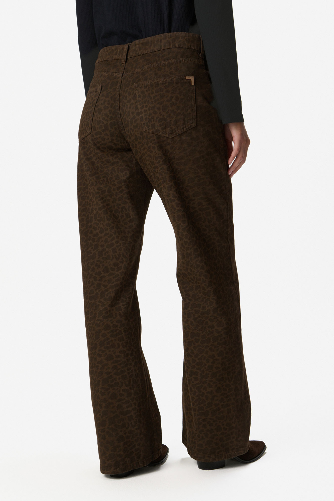 Pantalón de algodón con estampa animal print de inspiración vintage en tonos tierra. Calce recto con bota levemente flare y tiro medio alto que estiliza la figura y realza la cintura. Algodón 100%.