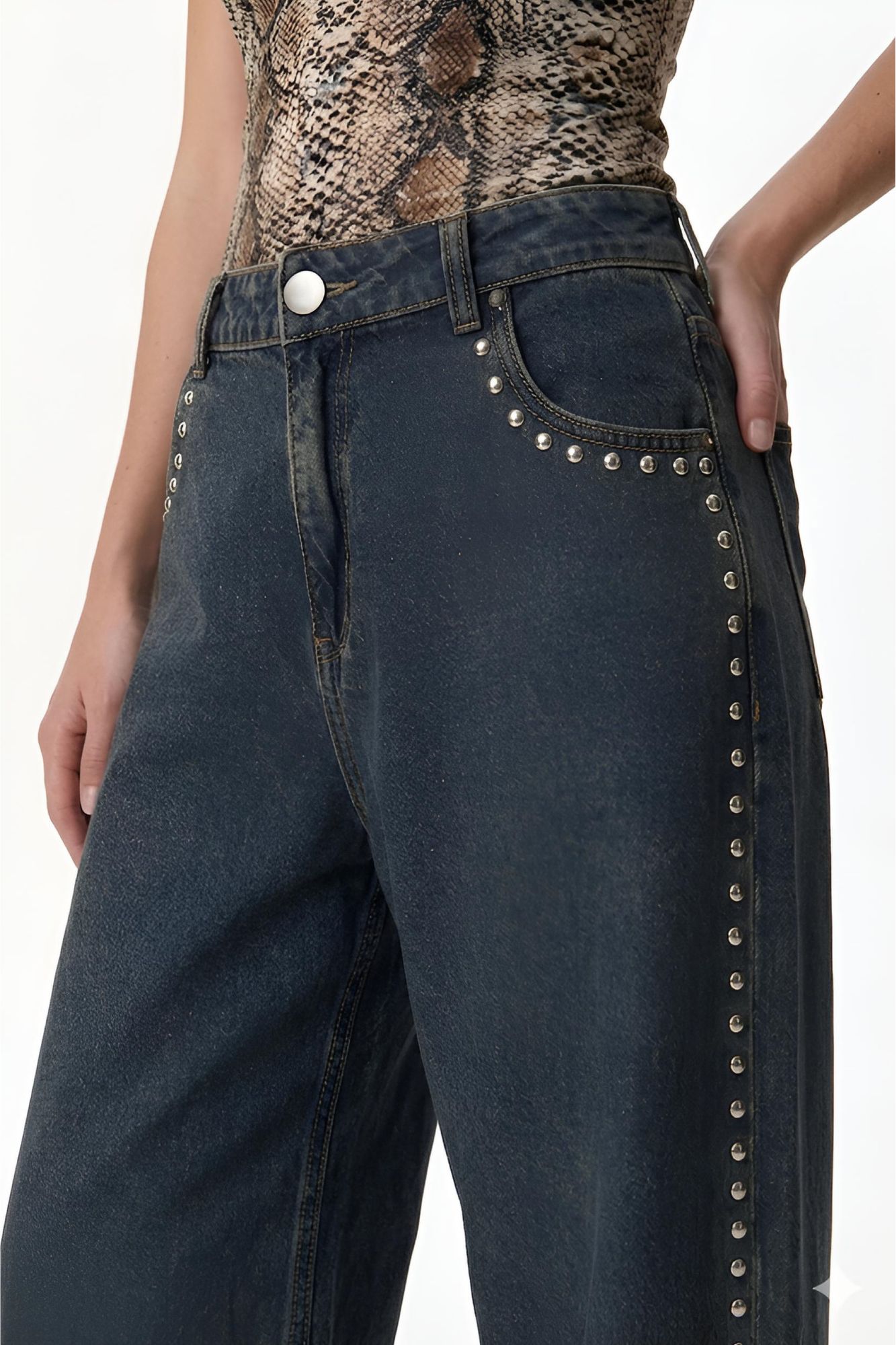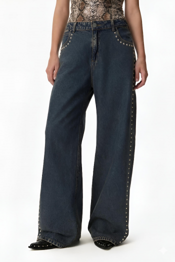 Jean wide leg de tiro alto, con largo full length. Ajusta en la cintura y se amplía desde la cadera hasta el ruedo, generando una silueta amplia y canchera. De aspecto levemente desgastado que aporta un look urbano y versátil. Presenta detalles de tachas metálicas a lo largo de los laterales que suman un toque distintivo. Bolsillos funcionales y cierre frontal con botón y cremallera. 100% Algodón.