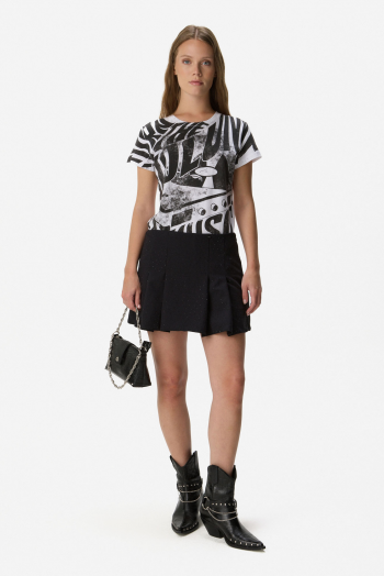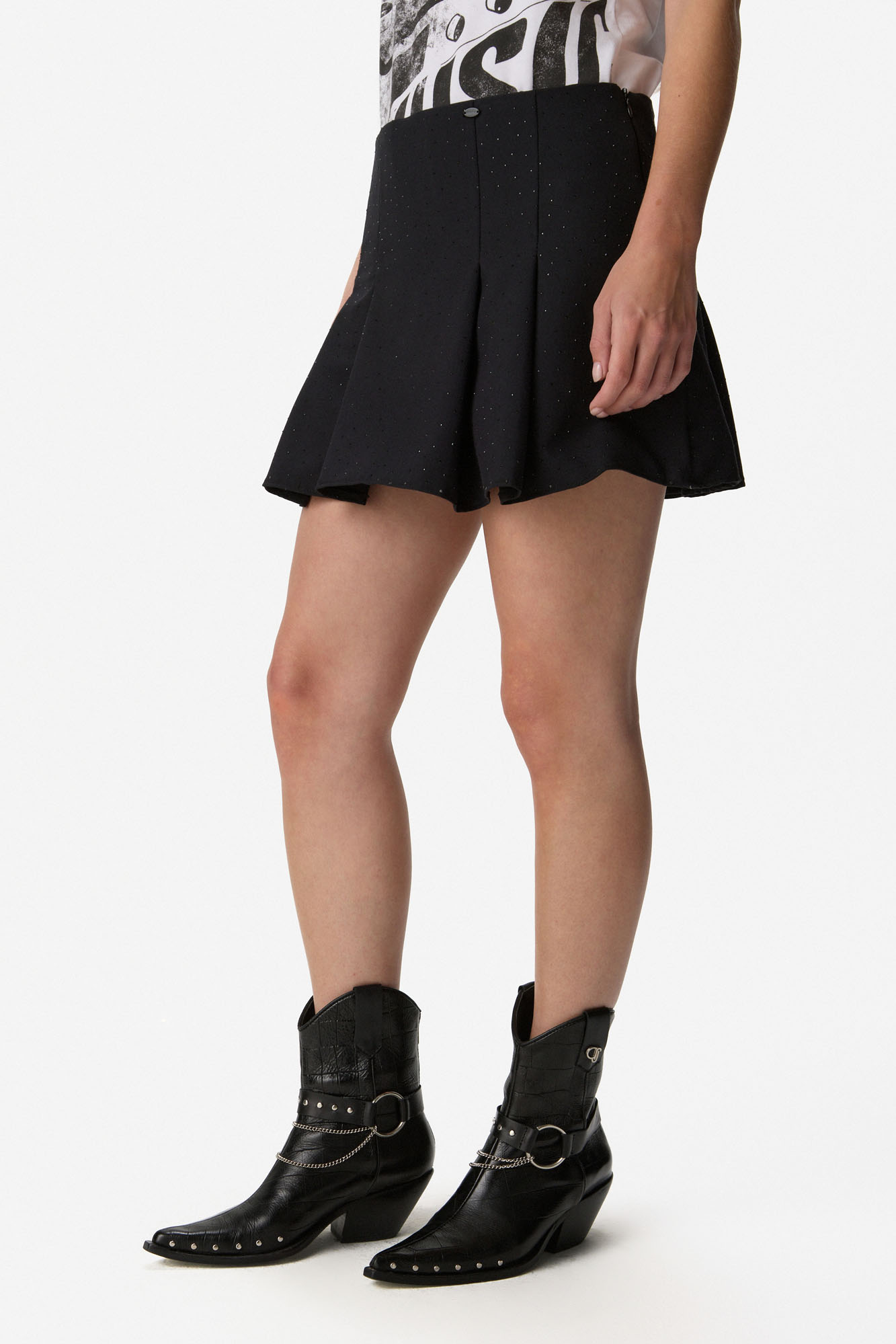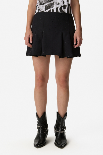 Mini con short incorporado, con leve vuelo que aporta movimiento. Presenta cintura alta con calce favorecedor y cierre lateral oculto para mayor prolijidad. Detalle de strass en toda la prenda que suma brillo sutil y sofisticación. Confeccionada en tejido liviano y estructurado, ideal para looks de día o noche. 100% Poliéster