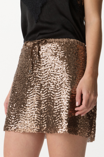 Falda corta confeccionada en tejido de poliéster con acabado de lentejuelas que aporta brillo y textura. Presenta cintura de satén elastizada con ajuste mediante lazo, brindando comodidad y mejor calce. Silueta recta, ideal para looks nocturnos o de fiesta. 100% poliéster.