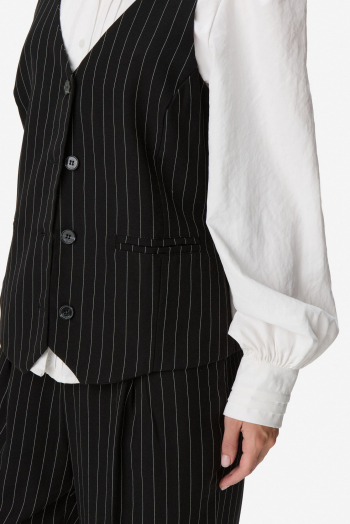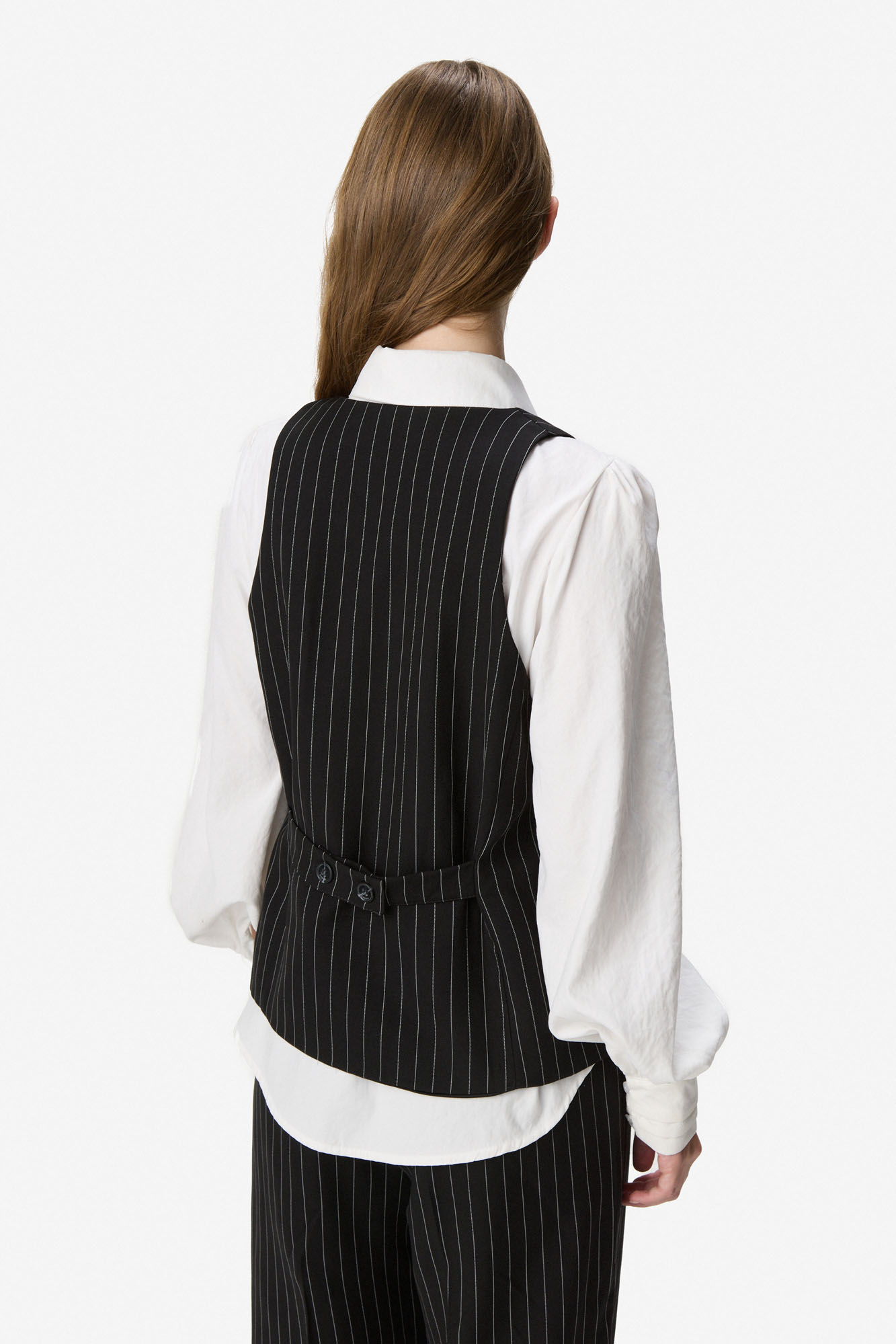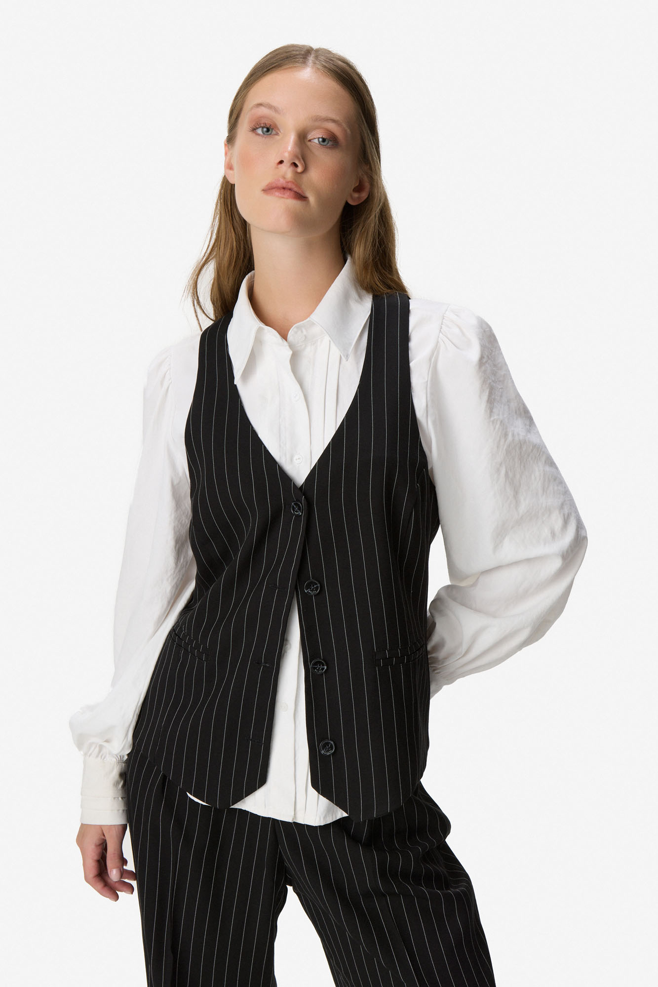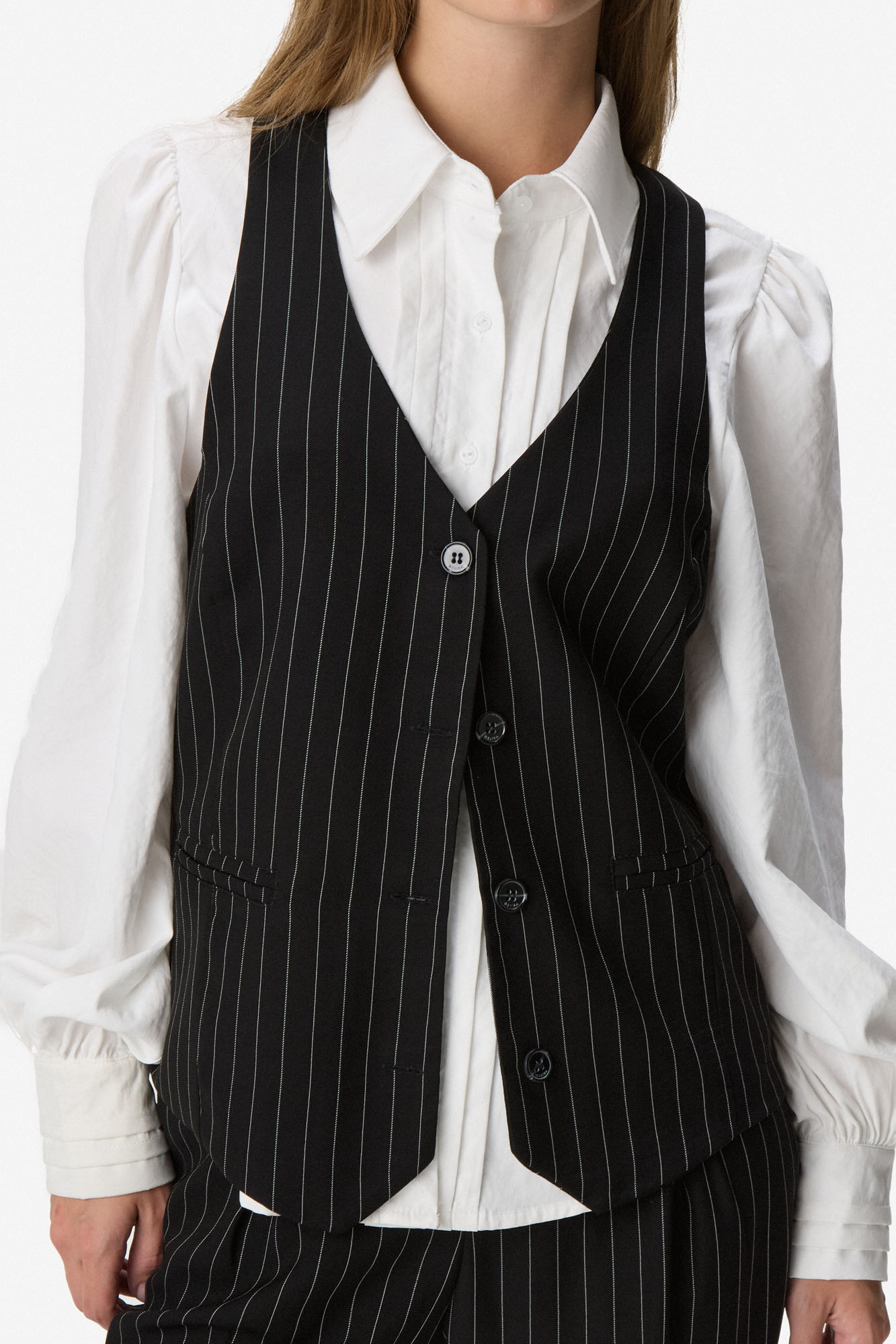 Chaleco confeccionado en tejido sastrero a rayas, con escote en V y cierre frontal con botones a tono. Presenta bolsillos delanteros decorativos y calce entallado que realza la silueta. Forrado en su interior para mayor comodidad y mejor caída. Ideal para llevar solo o en conjunto. 82% rayón, 6% nylon, 2% poliéster. Forrado.