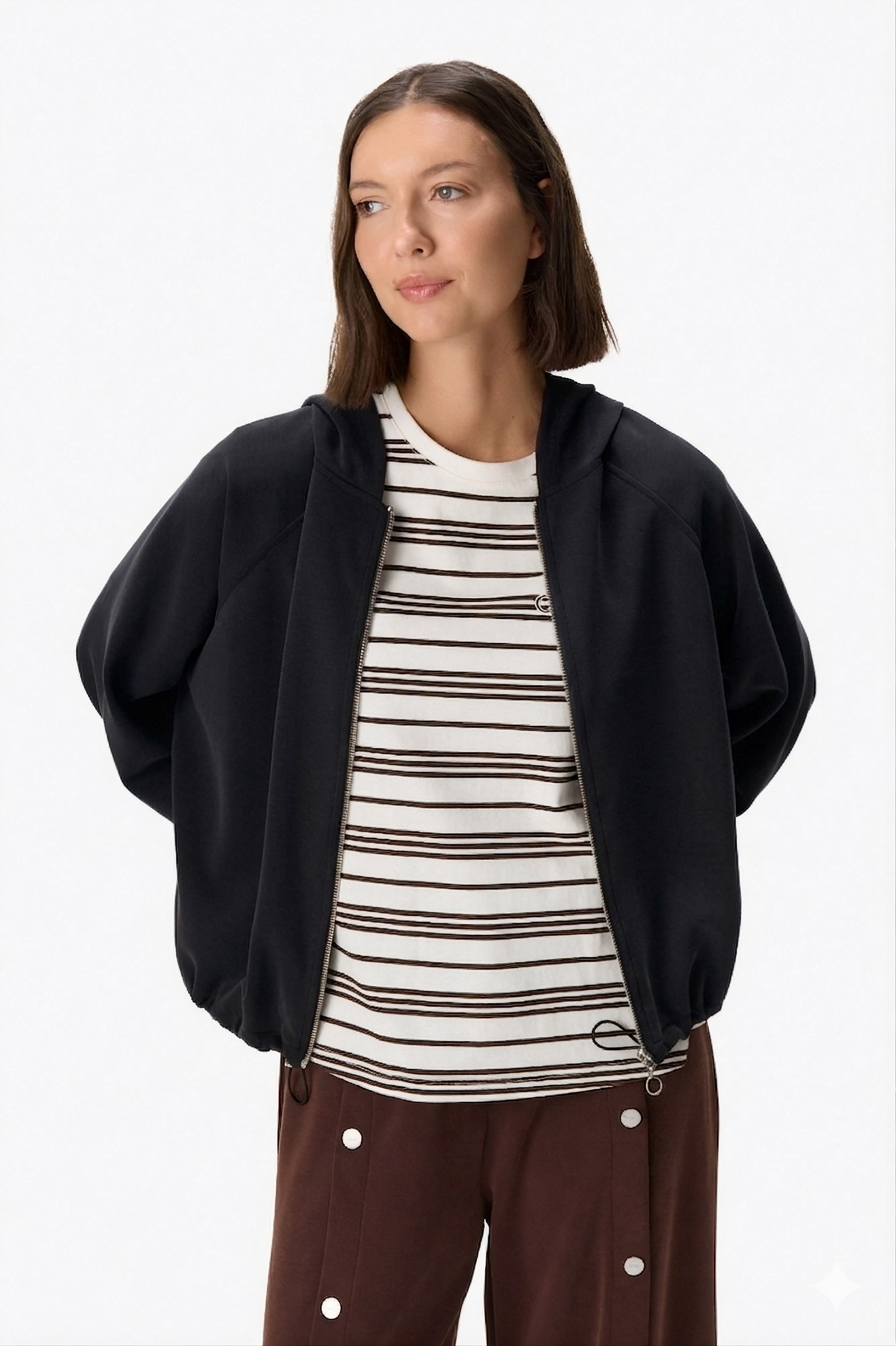 Campera con capucha de tejido suave, diseño minimalista de líneas limpias con cierre frontal y bolsillos laterales funcionales. Presenta mangas largas con puño y detalle de tiras ajustables internas para entallar la cintura y adaptar el calce. Con capucha y terminaciones prolijas que aportan comodidad y versatilidad. Textura flexible y confortable. 50% Poliéster 45% Rayon 5% Spandex