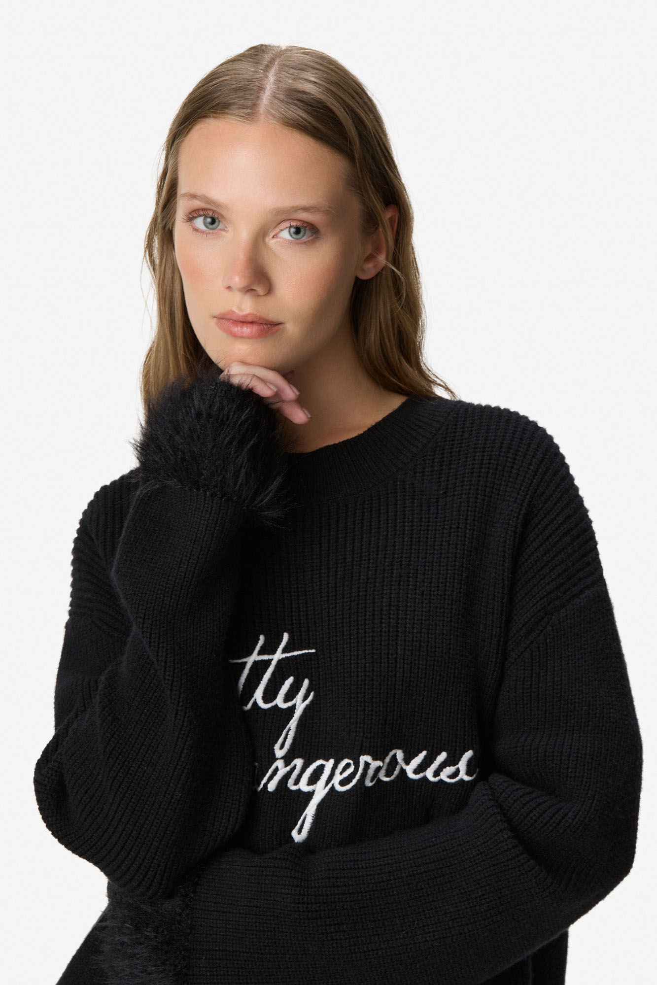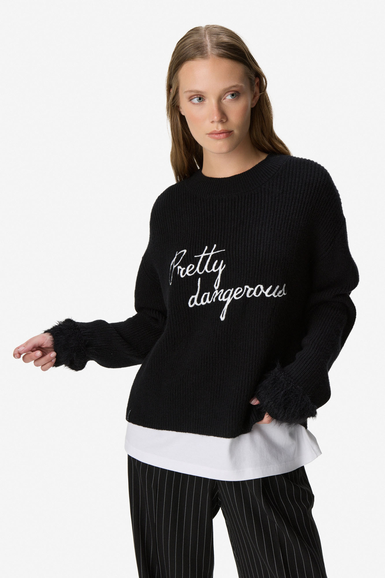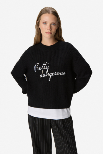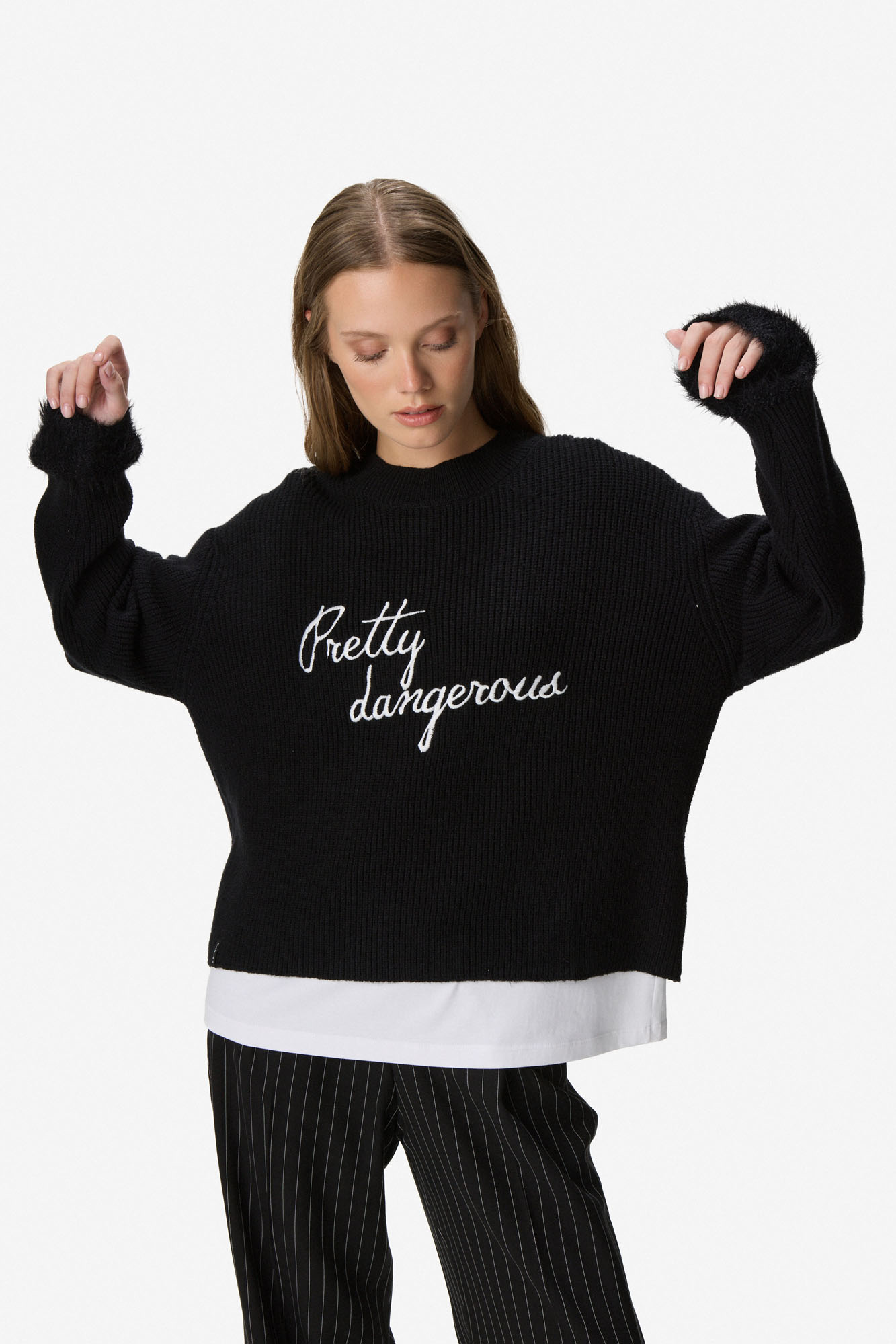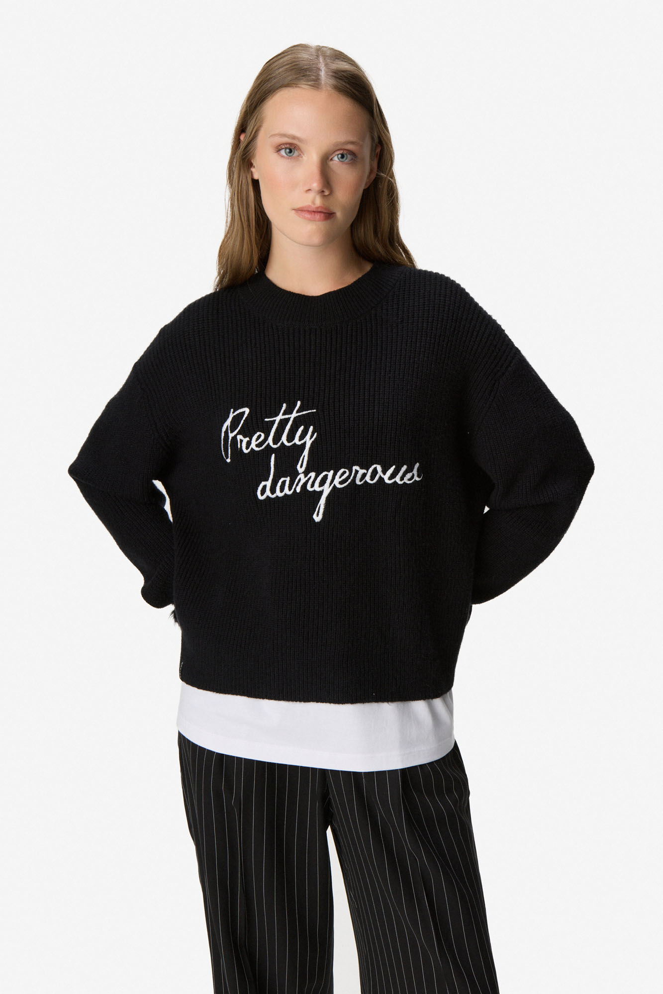 Sweater de manga larga en tejido de punto. Presenta un calce relajado, de silueta amplia y caída recta, ideal para un look cómodo y moderno. Diseño de cuello redondo con detalle de tipografía bordada en contraste en el frente, que aporta un acento distintivo. Mangas largas con terminación acanalada y detalle de textura en puños. 48% Viscosa 26% Poliamida 26% Poliester.