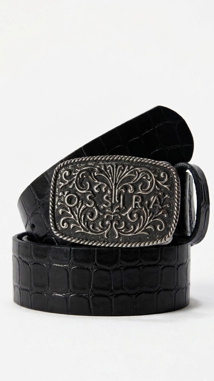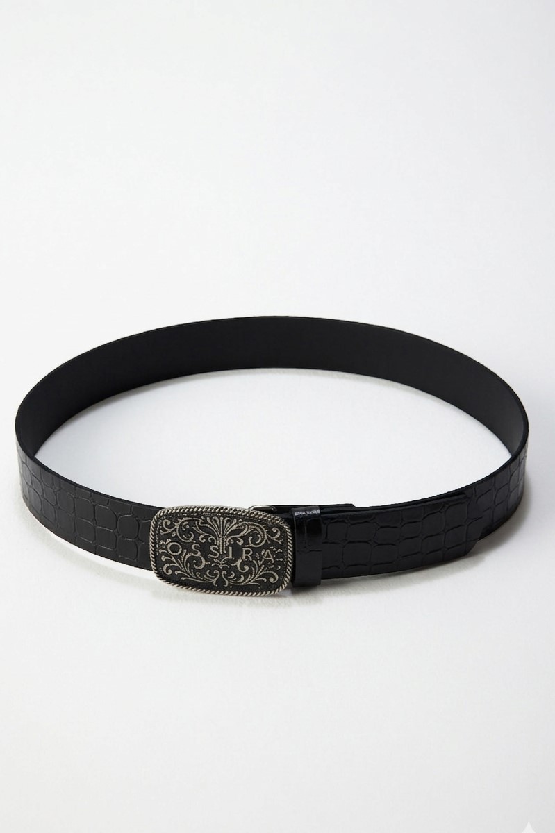Cinturón con textura tipo reptil, de acabado brillante y diseño elegante. Hebilla metálica con grabado ornamental en relieve. Ajuste clásico con pasador. Material símil cuero vacuno y metal.Todos nuestros cinturones se fabrican de forma artesanal y a mano. El cuero de buena calidad, puede presentar variaciones e imperfecciones propias de un material natural, lo que los hace únicos.