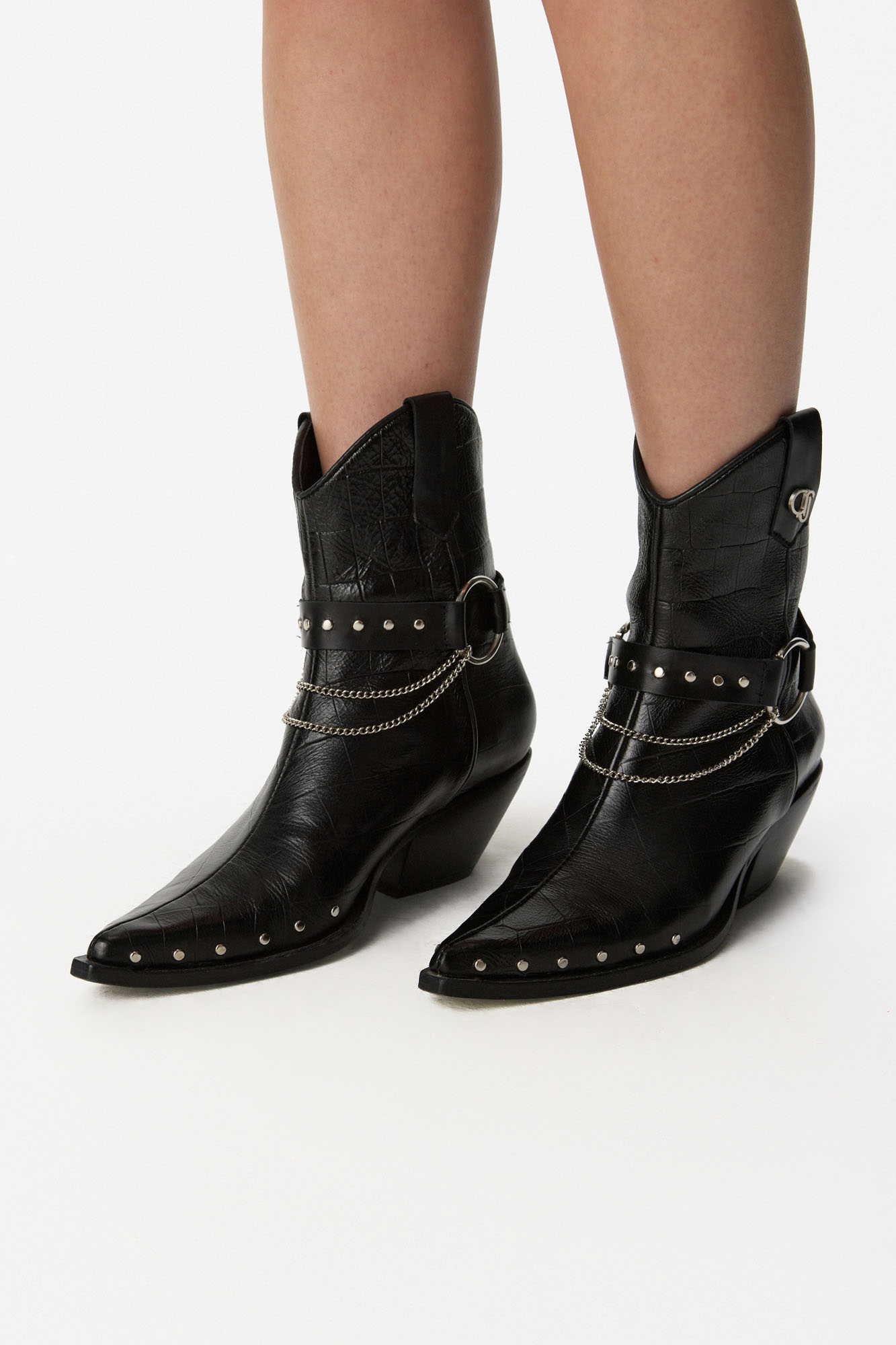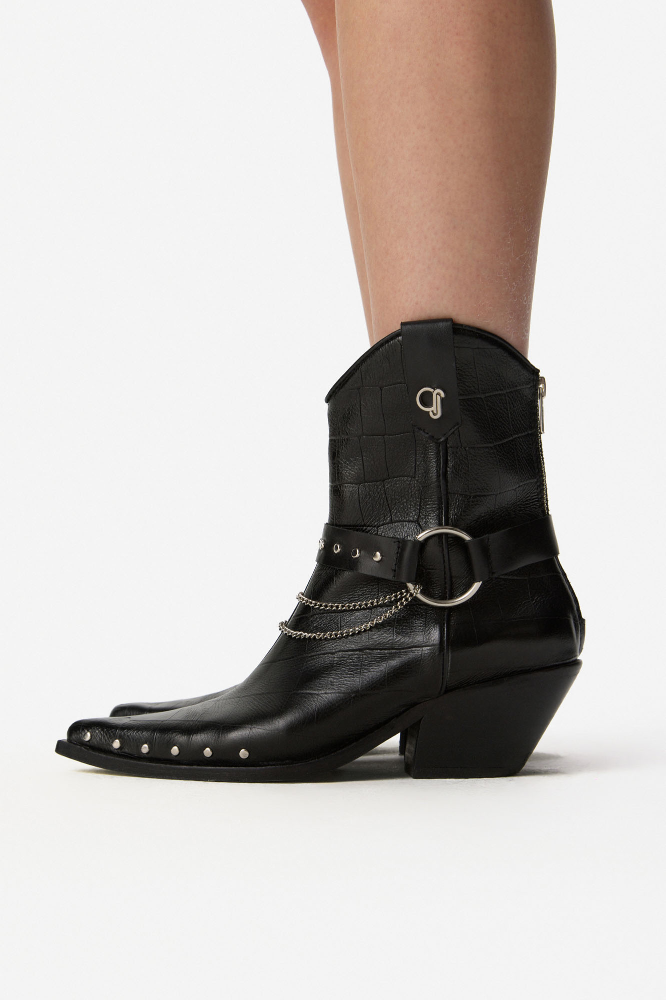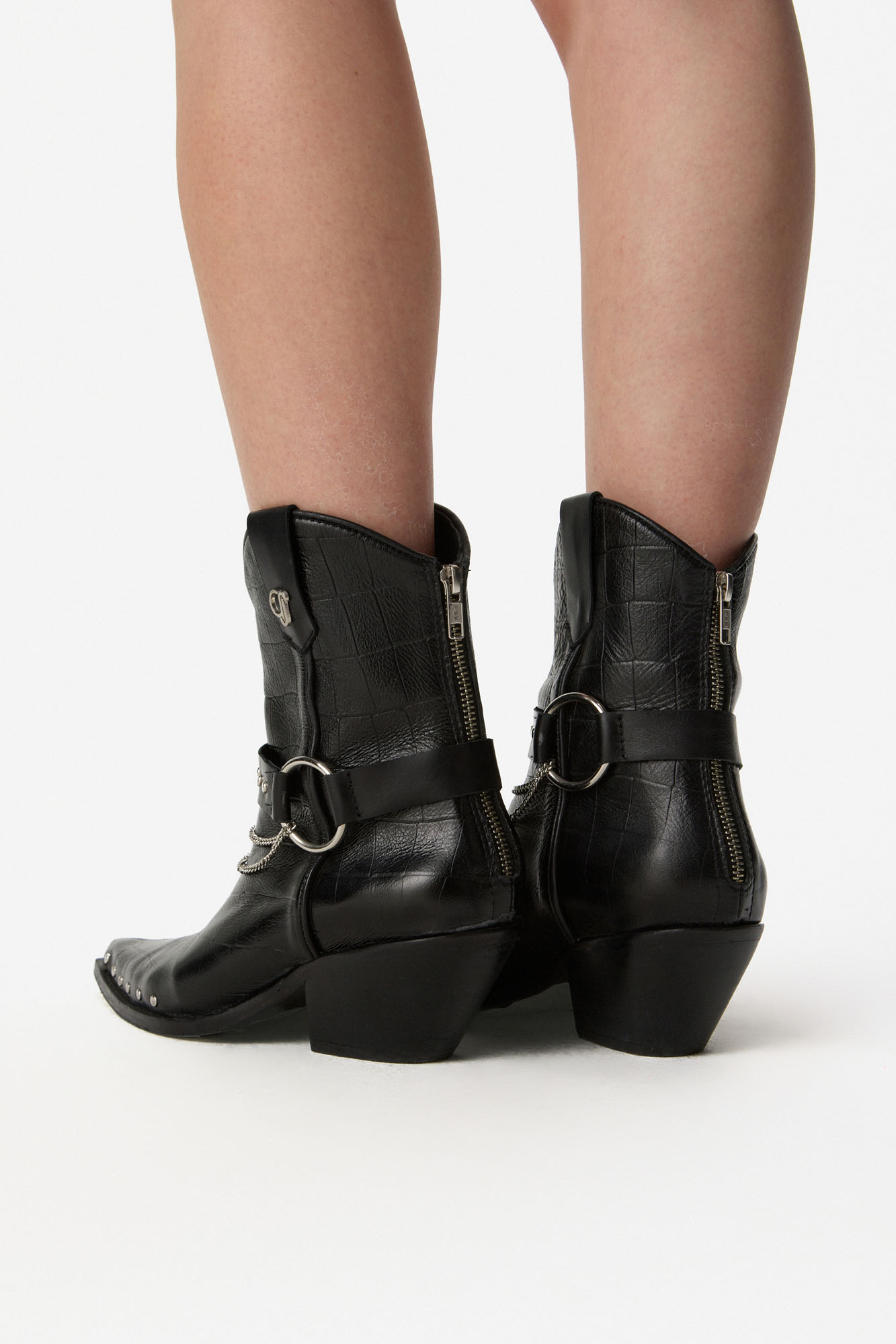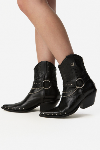 Bota de caña baja en cuero con acabado texturado tipo croco, que aporta un aire sofisticado y moderno. Diseño con apliques metálicos, hebillas y cadenas que suman carácter y actitud. Presenta plantilla confortable para un uso diario. Taco medio que brinda estabilidad y estilo. Confeccionada en 100% cuero vacuno.