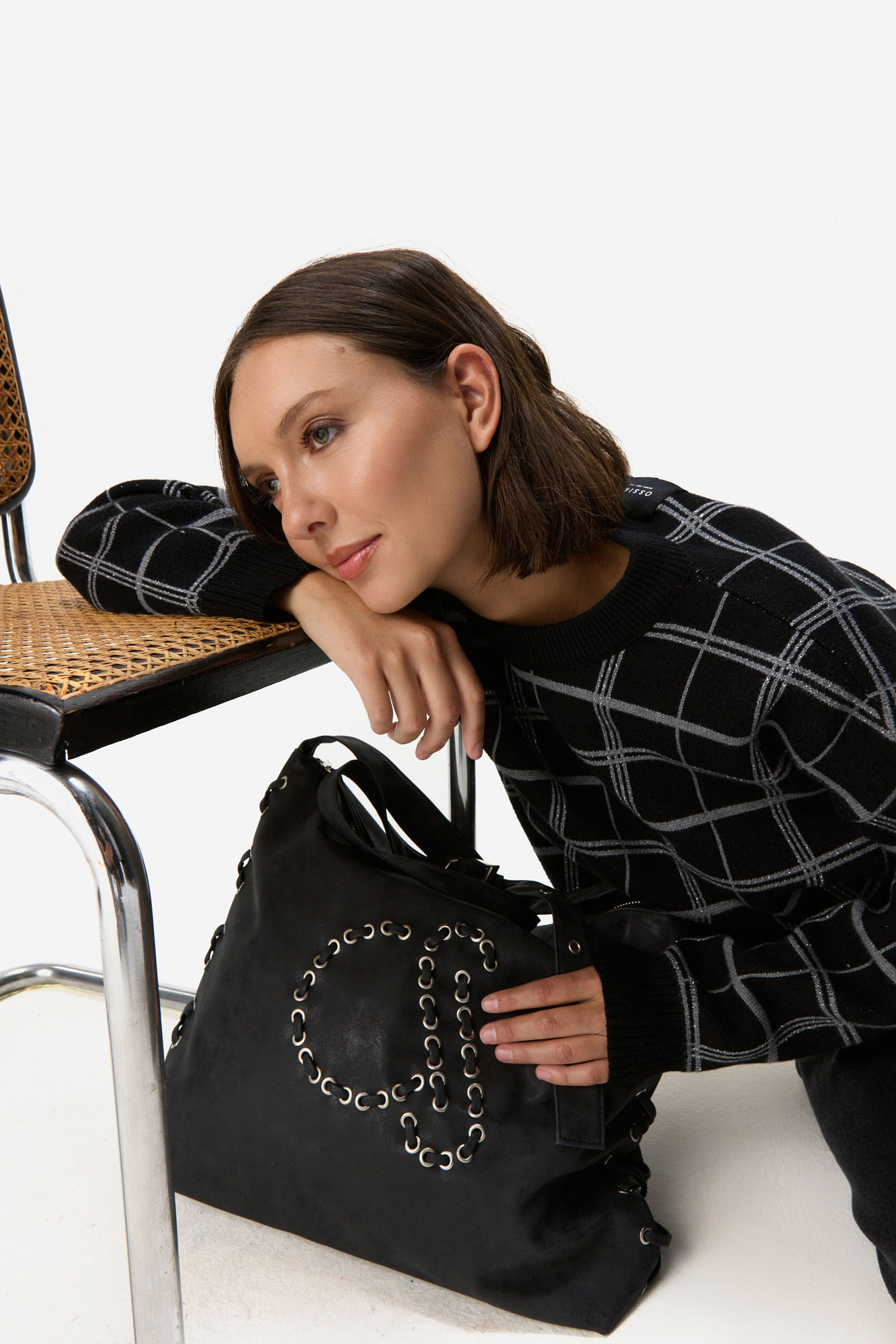 Bolso confeccionado en material con acabado símil gamuza. Correa larga regulable para llevar al hombro. Detalle frontal de monograma OSS metálico aplicado. Laterales con recortes y detalle trenzado. Acceso superior con cierre. Interior forrado con bolsillo interno. 100% PU.