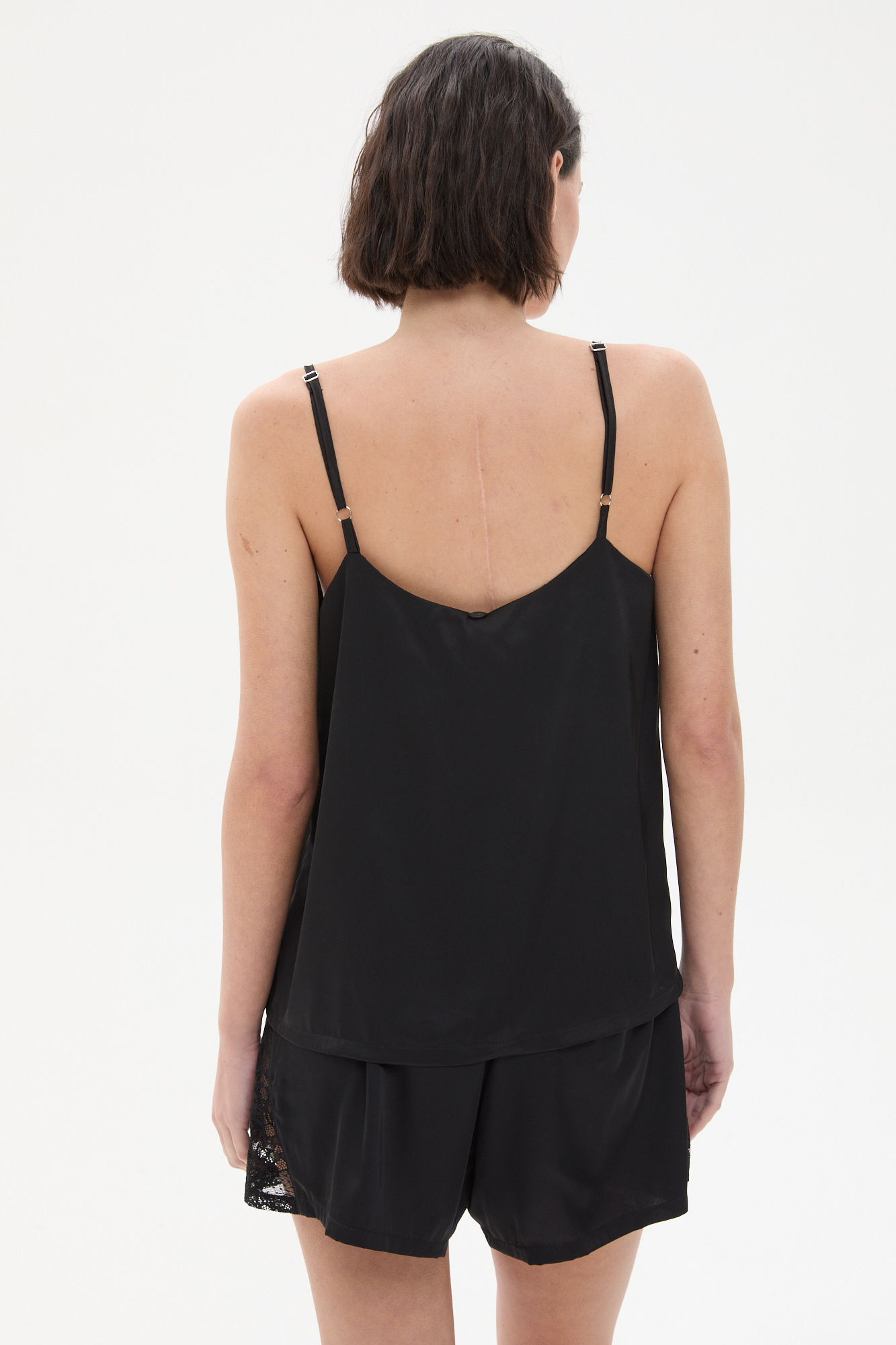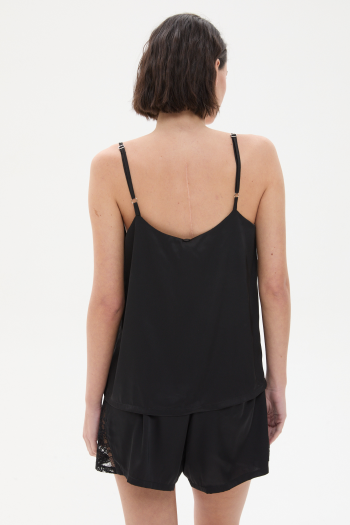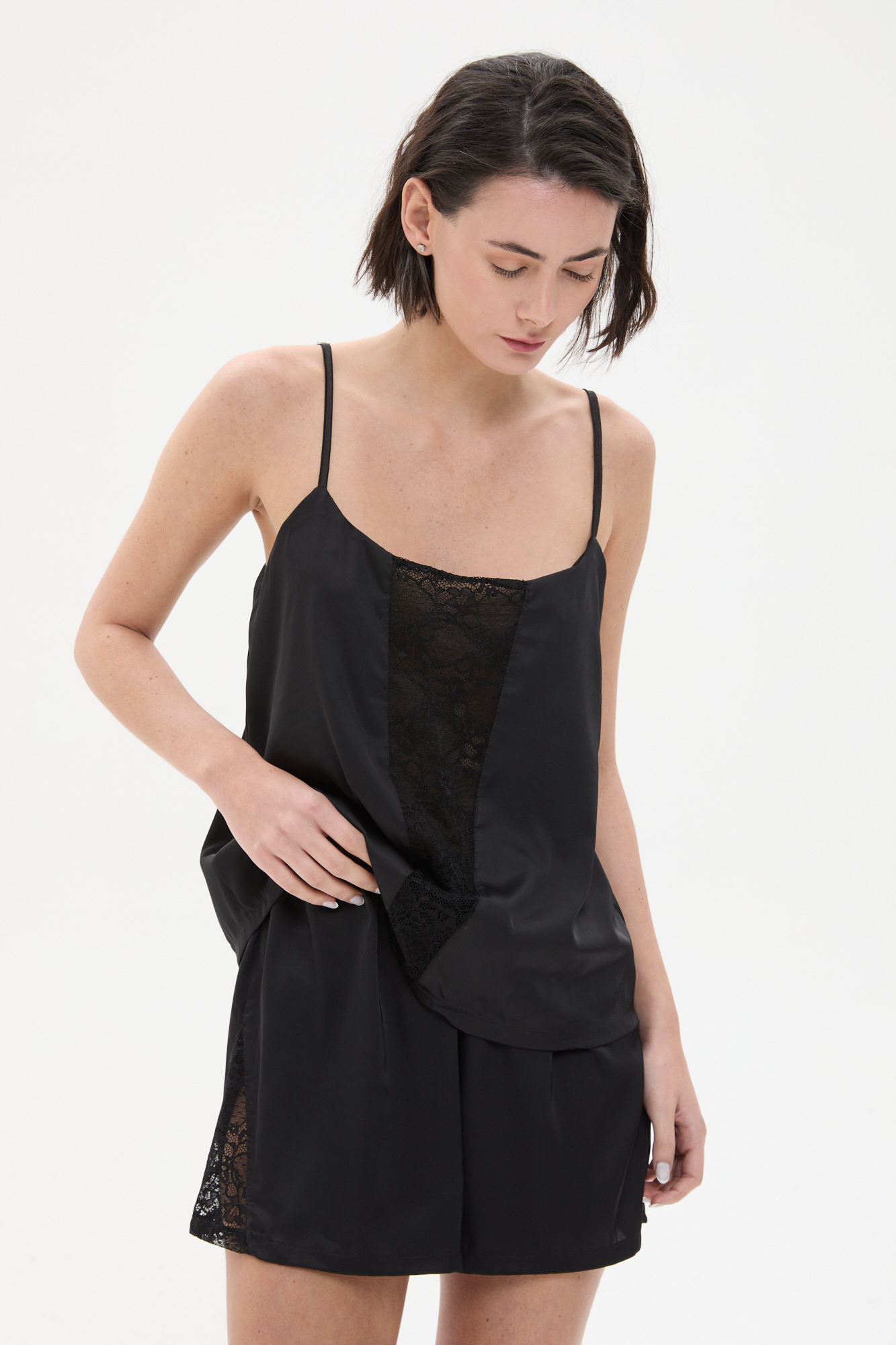 Pijama de satén con encaje. Conjunto de top con breteles finos y detalle de encaje en el frente, acompañado de short con cintura elastizada y terminaciones delicadas. Su textura suave y elástica brinda un calce cómodo y favorecedor. Una propuesta elegante y femenina, ideal para descansar con estilo.Composición Parte de arriba: 97% poliéster 3% spandex Parte de abajo: 97% poliéster 3% spandex
