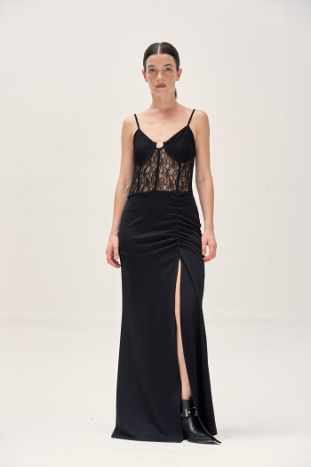VESTIDO LARGO DE ENCAJE Y TAJO